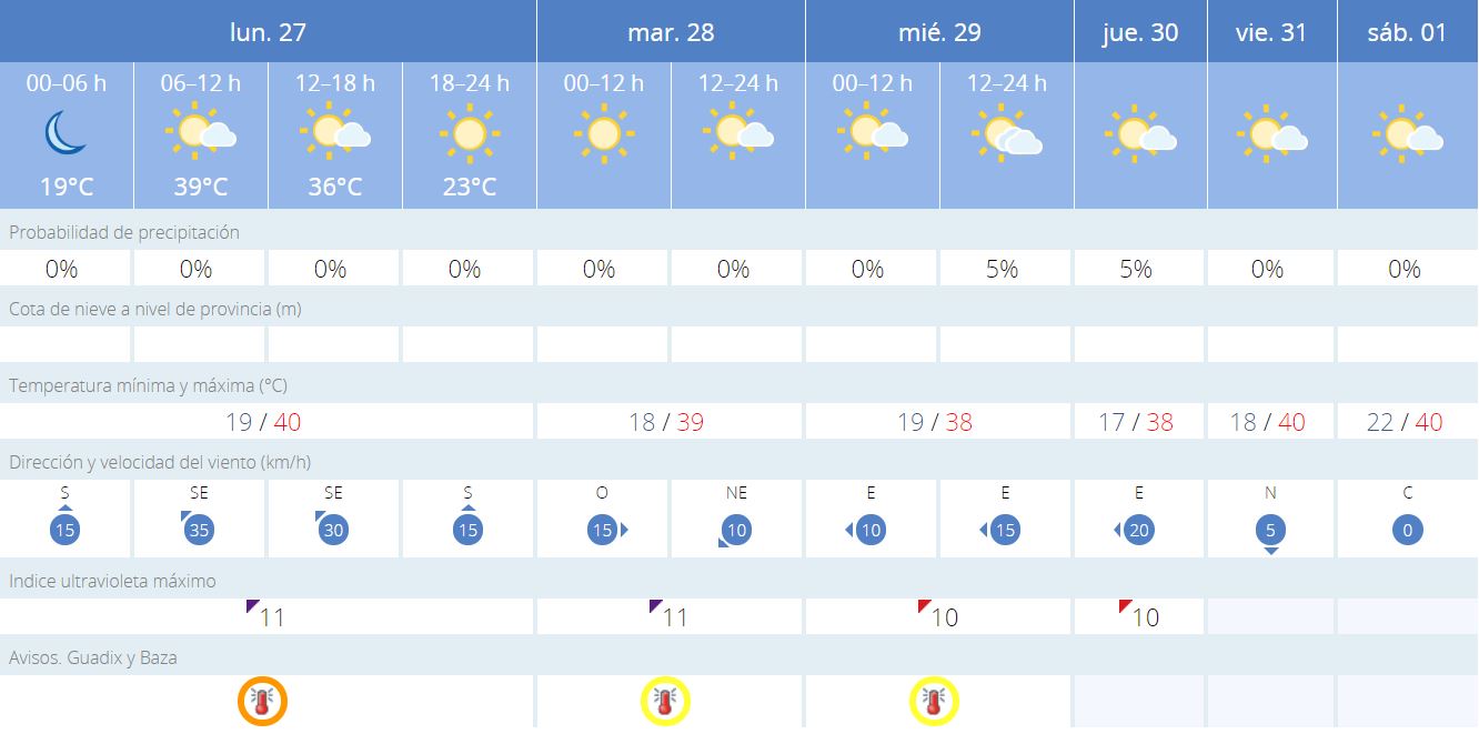 No obstante, no se quedan ahí las previsiones, que anuncian la vuelta a los 38ºC para el martes y miércoles próximo, lo que de por sí ya significaría estar en alerta amarilla y, para colmo, los 40ºC que se vuelven a anunciar para el viernes y sábado próximos, con el agravante de que la temperatura mínima ya se anuncia que podría alcanzar los 22ºC, algo que equivale a poder afirmar que lo peor está aún por venir y que nos quedan unas cuantas jornadas del calor más sofocante.