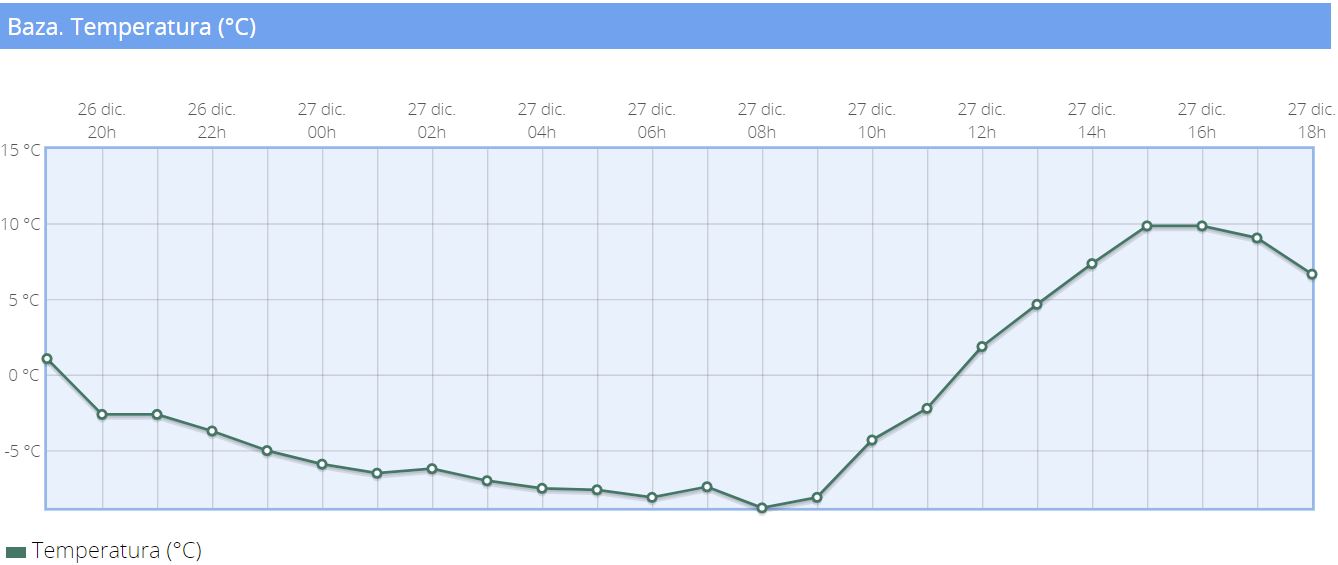 Importante también a tener en cuenta es la notable bajada de temperaturas, que ya el domingo llevó el termómetro hasta los -8,8ºC, a las ocho de la mañana de ayer domingo, siendo la segunda temperatura más baja de todo el país y después de que desde las 23,00 h. del sábado estuvieran ya los termómetros por debajo de los 5ºC, como se puede apreciar en el gráfico adjunto: