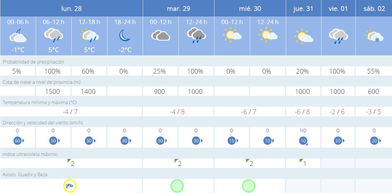Y, por si faltaba algo, presencia de la lluvia esta misma mañana en Baza, con precipitaciones escasas que podrían repetirse mañana, mientras que el jueves se sitúa la cota de nieve en los 800 m y el viernes y sábado las precipitaciones serían en forma de nieve, con la cota en 900 y 600 m., respectivamente y con un índice de probabilidades de entre el 70 y el 80%.