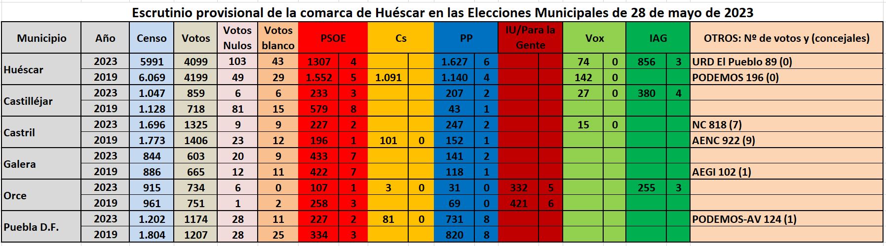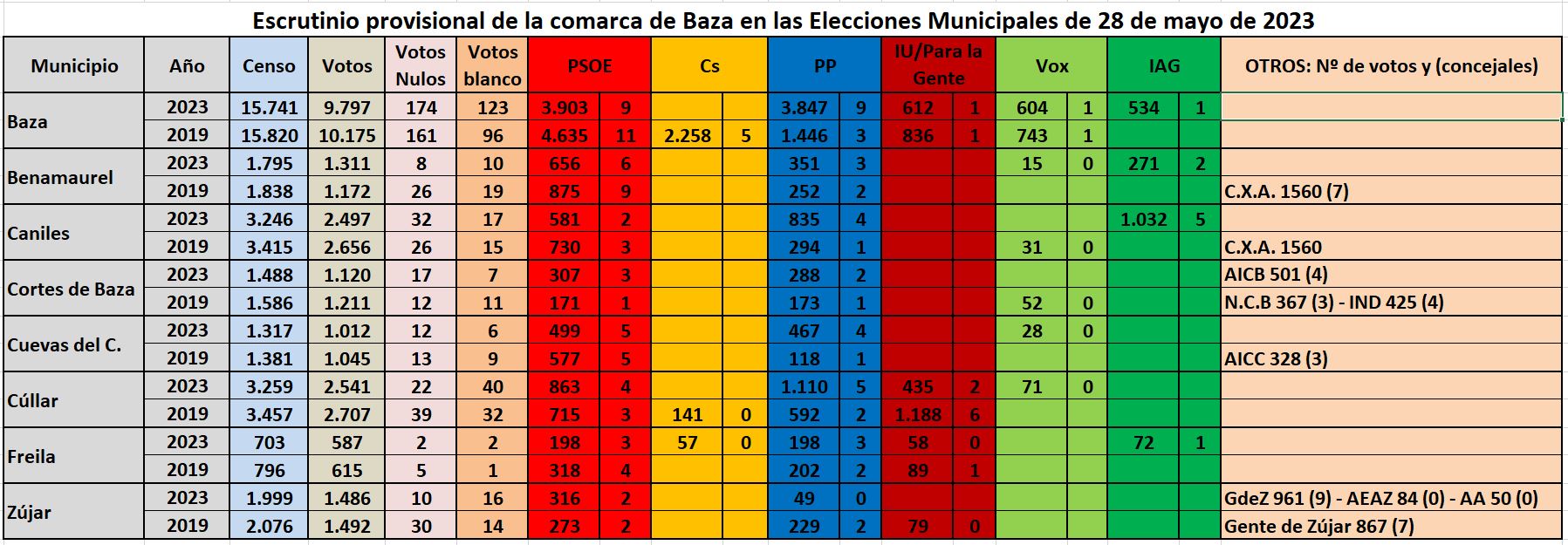 A nivel comarcal, también ha habido de todo, aunque hay municipios que conservan las mismas tendencias en sus votantes y han manteniendo la alcaldía de forma más o menos clara, conforme se puede ver en las tablas con los datos que hemos confeccionado con los resultados de los 14 municipios de las comarcas de Baza y Huéscar.