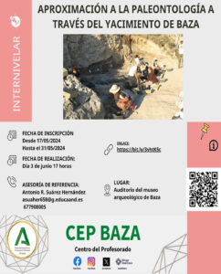 Jornada abierta al público sobre “Aproximación a la Paleontología a través del Yacimiento de Baza” a cargo de Bienvenido Navarro, esta tarde, en el Centro del Profesorado de Baza. Dentro de las actuaciones formativas del Centro Del Profesorado de Baza (CEP Baza) y más concretamente en su línea de patrimonio se inscribe una actividad formativa, jornada, “Aproximación a la Paleontología a través del Yacimiento de Baza” dirigida, no solamente al profesorado Internivelar de Baza, primaria, secundaria y enseñanzas postobligatorias, sino al público en general.
