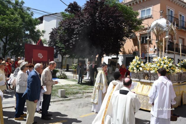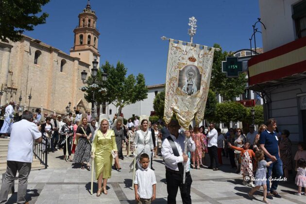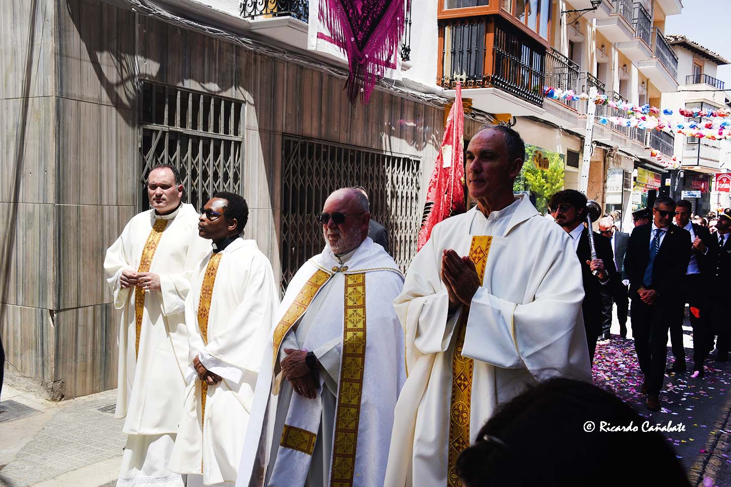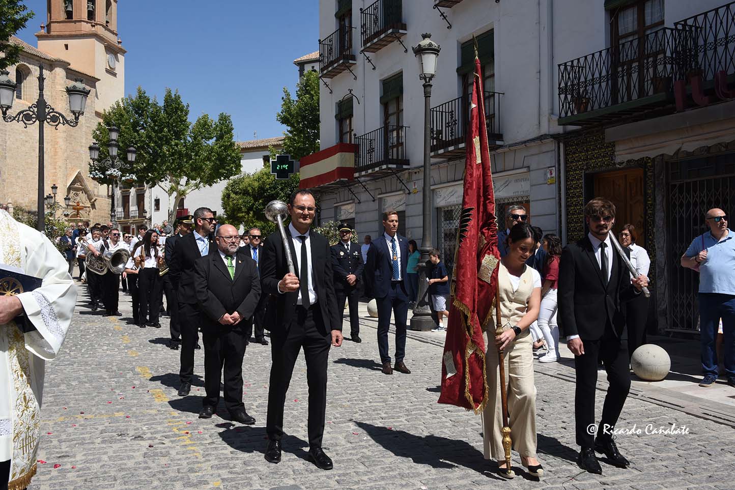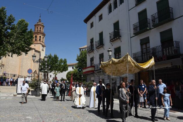 Una procesión que encabezaba una multitud de niños y niñas, con sus trajes de la Primera Comunión que habían recibido apenas unos días o unas semanas antes. Después, las Cofradías y Hermandades, con sus respectivos estandartes, una representación de Cáritas, que dispuso de su propio altar, y miembros de la Junta de Gobierno de la Federación de Cofradías, en un año en el que la presencia particular de personas quedó como algo testimonial, más allá del coro que acompañaba al párroco de la Iglesia de Santiago, encargado de organizar los cánticos y oraciones ante los diferentes altares instalados a lo largo del recorrido. Después una simbólica y mínima representación de la Corporación Municipal, con exclusiva y escasa participación del grupo del Equipo de Gobierno, que además fue el único partido que se hizo presente. En este sentido, recordemos que, conforme a los acuerdos vigentes, esta procesión está contemplada entre las que requieren la presencia en ella de la Corporación Municipal, bajo mazas. Además, los responsables de la Guardia Civil, Policía Nacional y Policía Local, junto a los que iba el alcalde bastetano. Cerraban la comitiva los sacerdotes de las otras tres parroquias, Mayor, San Juan y Cuevas, seguidos por el palio y la Banda Municipal.