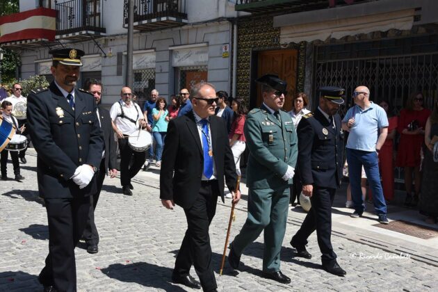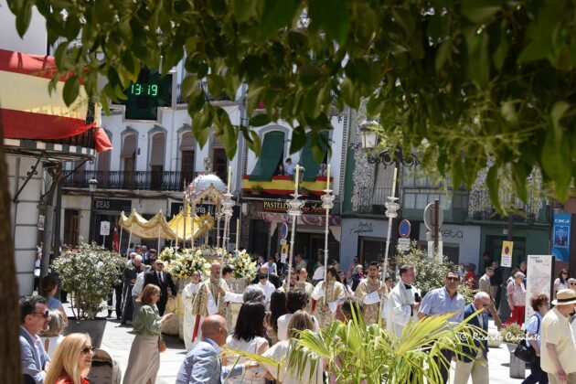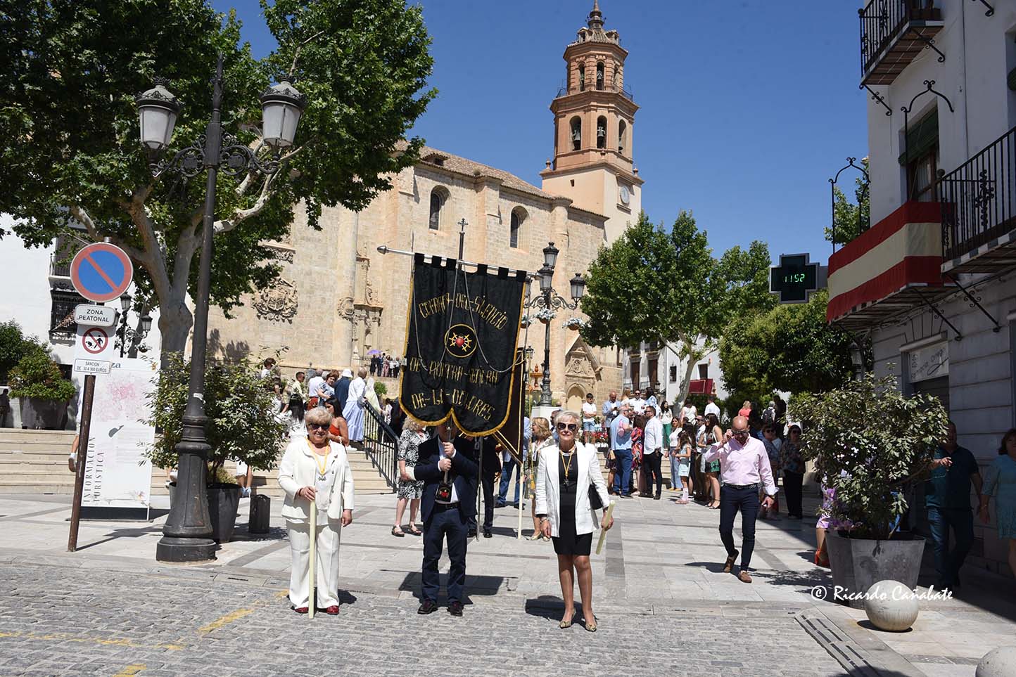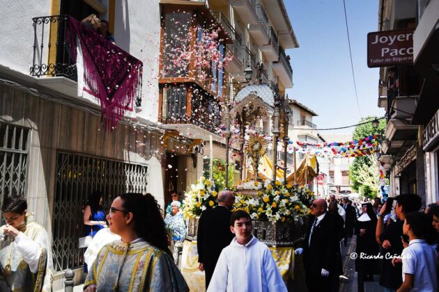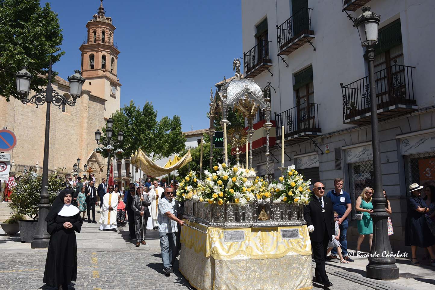 Una procesión que encabezaba una multitud de niños y niñas, con sus trajes de la Primera Comunión que habían recibido apenas unos días o unas semanas antes. Después, las Cofradías y Hermandades, con sus respectivos estandartes, una representación de Cáritas, que dispuso de su propio altar, y miembros de la Junta de Gobierno de la Federación de Cofradías, en un año en el que la presencia particular de personas quedó como algo testimonial, más allá del coro que acompañaba al párroco de la Iglesia de Santiago, encargado de organizar los cánticos y oraciones ante los diferentes altares instalados a lo largo del recorrido. Después una simbólica y mínima representación de la Corporación Municipal, con exclusiva y escasa participación del grupo del Equipo de Gobierno, que además fue el único partido que se hizo presente. En este sentido, recordemos que, conforme a los acuerdos vigentes, esta procesión está contemplada entre las que requieren la presencia en ella de la Corporación Municipal, bajo mazas. Además, los responsables de la Guardia Civil, Policía Nacional y Policía Local, junto a los que iba el alcalde bastetano. Cerraban la comitiva los sacerdotes de las otras tres parroquias, Mayor, San Juan y Cuevas, seguidos por el palio y la Banda Municipal.