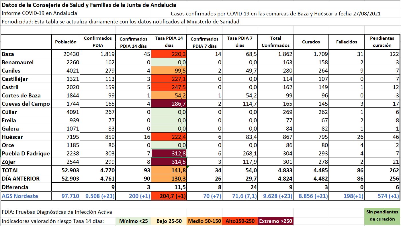 Consecuencia de estos aumentos, el paso de las localidades de Cuevas del Campo y Puebla de don Fadrique al índice de nivel extremo, mientras que la localidad de Freila ponía sus contagios y tasas a cero y volvía a estar en nivel mínimo.
