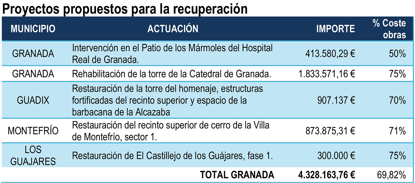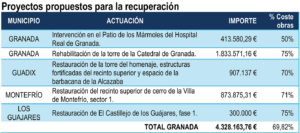 Dos actuaciones que, en definitiva, han quedado fuera de las decisiones del Ministerio de Transportes y Movilidad Sostenible y el Ministerio de Vivienda y Agenda Urbana, en el marco del Programa 2% Cultural, para el que sí se han propuesto un total de 5 proyectos ubicados en la provincia de Granada, a los que hay que felicitar por su logro. Se trata de la Intervención en el Patio de los Mármoles del Hospital Real de Granada (413.580,29 €), la Rehabilitación de la torre de la Catedral de Granada (1.833.571,16 €), la Restauración de la Torre del Homenaje, estructuras fortificadas del recinto superior y espacio de la barbacana de la Alcazaba de Guadix (907.137 €), la Restauración del recinto superior de cerro de la Villa de Montefrío, sector 1 (873.875,31 €) y la Restauración de El Castillejo de los Guájares, fase 1 (300.000 €).