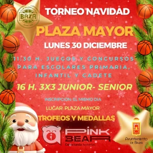 El PinkBear CB Baza celebrará hoy su Torneo Callejero de Navidad con “Baloncesto en la calle”: un evento para promover el deporte y la convivencia en un entorno navideño. Hoy lunes 30 de diciembre, la Plaza Mayor de nuestra ciudad se convertirá en el escenario de una jornada de baloncesto al aire libre, destinada a fomentar la práctica deportiva y la participación ciudadana en un ambiente festivo y navideño. Este evento, que se desarrollará en una de las zonas más emblemáticas del municipio, ofrece una oportunidad única para disfrutar del deporte mientras se celebra la temporada navideña.