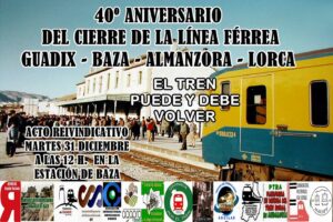 Convocatoria para el acto reivindicativo por la vuelta del tren al cumplirse 40 años del cierre de la línea férrea Guadix Baza Almanzora Lorca. Una convocatoria que se hace por las habituales asociaciones activas en este asunto durante los últimos años, a través del comunicado que reproducimos a continuación, junto a la imagen que lo acompaña: