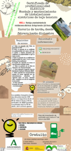 El IES P. J. Montoya oferta un certificado de profesionalidad ELEE0109, sobre el nivel 2 de Montaje y mantenimiento de instalaciones eléctricas de baja tensión. Se trata de una acción formativa conducente al certificado de profesionalidad, impartida en el IES Pedro Jiménez Montoya de Baza y financiada con créditos del Ministerio de Educación y Formación Profesional, sobre lo que se puede requerir mayor información o realizar la preinscripción en el mail cdp.pjm@g.educaand.es o el teléfono 609 46 38 24.