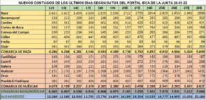 Los últimos datos de la pasada semana dejan en 65 los nuevos contagios en las comarcas de Baza y Huéscar, y 147 en el AGS Nordeste donde hubo un fallecido. Son datos facilitados por la Consejería de Salud de la Junta de Andalucía en la mañana del pasado viernes, los cuales evidencian también un descenso más significativo de las tasas de incidencia, al recortarse 213,2 casos por 100.000 habitantes en la tasa a 14 días de estas dos comarcas, la cual se redujo a 120 casos en lo referente al AGS, mientras que las tasas de datos a 7 días registraron variaciones mínimas y lo más lamentable fue sumar un fallecimiento más en la comarca de Guadix, que es la que completa el territorio del AGS Nordeste. Destacar en este sentido a las localidades de Caniles, que baja su tasa por debajo de los 1.000 casos y Puebla de don Fadrique que ya tiene esa tasa por debajo de los 500.