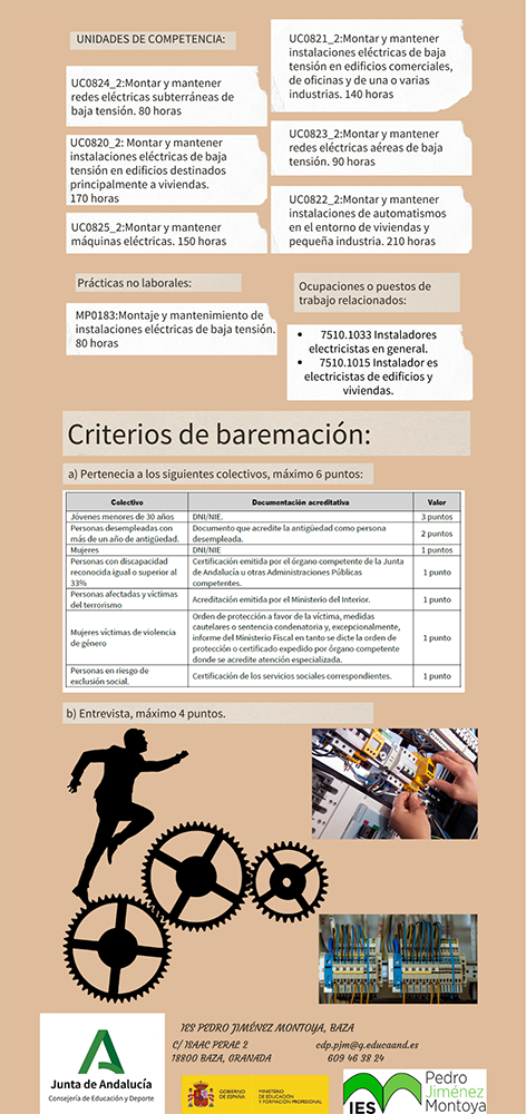 El IES P. J. Montoya oferta un certificado de profesionalidad ELEE0109, sobre el nivel 2 de Montaje y mantenimiento de instalaciones eléctricas de baja tensión. Se trata de una acción formativa conducente al certificado de profesionalidad, impartida en el IES Pedro Jiménez Montoya de Baza y financiada con créditos del Ministerio de Educación y Formación Profesional, sobre lo que se puede requerir mayor información o realizar la preinscripción en el mail cdp.pjm@g.educaand.es o el teléfono 609 46 38 24.