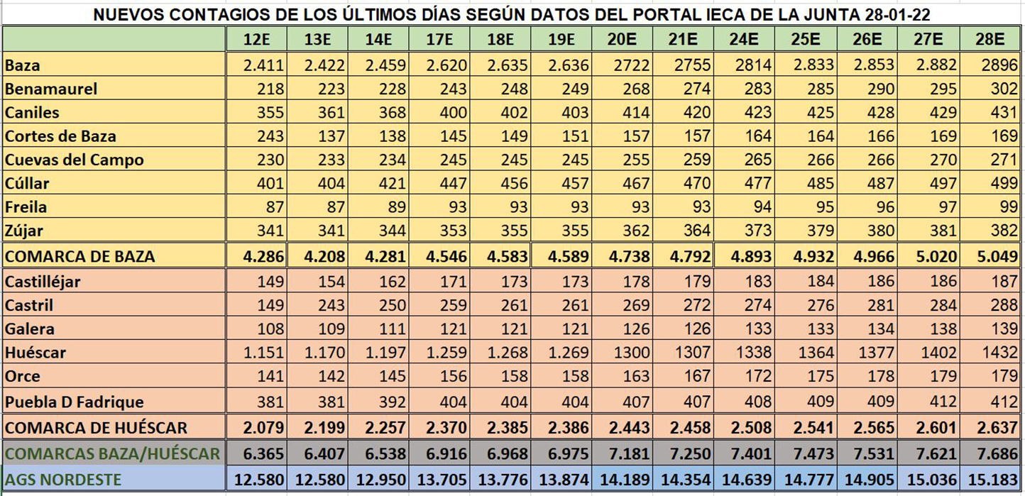 Los últimos datos de la pasada semana dejan en 65 los nuevos contagios en las comarcas de Baza y Huéscar, y 147 en el AGS Nordeste donde hubo un fallecido. Son datos facilitados por la Consejería de Salud de la Junta de Andalucía en la mañana del pasado viernes, los cuales evidencian también un descenso más significativo de las tasas de incidencia, al recortarse 213,2 casos por 100.000 habitantes en la tasa a 14 días de estas dos comarcas, la cual se redujo a 120 casos en lo referente al AGS, mientras que las tasas de datos a 7 días registraron variaciones mínimas y lo más lamentable fue sumar un fallecimiento más en la comarca de Guadix, que es la que completa el territorio del AGS Nordeste. Destacar en este sentido a las localidades de Caniles, que baja su tasa por debajo de los 1.000 casos y Puebla de don Fadrique que ya tiene esa tasa por debajo de los 500.