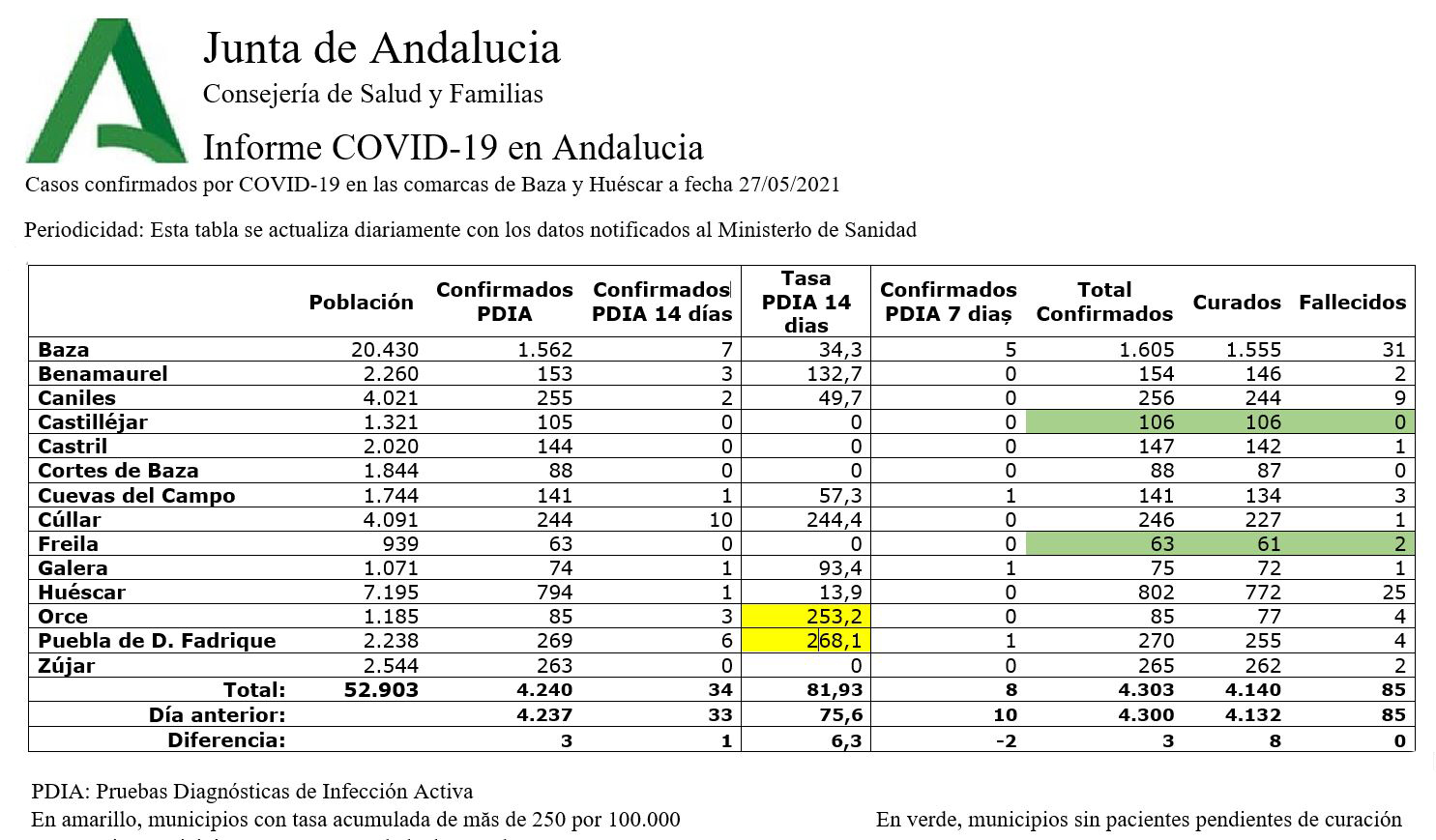 Por último, comentar que según los últimos datos de la Consejería de Salud de la Junta de Andalucía, que se facilitaron el pasado viernes, las comarcas de Baza y Huéscar sumaban ya 4.303 positivos, con una leve mejora de la tasa de incidencia general , a 14 días, añadiendo 8 personas curadas (4.140 ya), por solo 3 que se habían contagiado, como se puede ver en la tabla que adjuntamos a esta noticia.