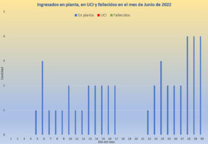 Los ingresados por Covid en los últimos días han vuelto a registrar un nuevo incremento en Baza, tras un mes de Junio con un tope de 4 ingresos, ninguno de ellos en planta y sin fallecimientos por Covid. El mes de Junio finalizaba con 22 de sus 30 días en los que el Hospital de Baza tenía encamado algún paciente Covid, si bien 7 de esos días solo había un ingresado, 10 días hubo dos ingresados, 2 días se registraron hasta tres ingresados y los últimos 3 días del mes eran ya 4 las personas hospitalizadas por Covid, con lo que parecía un incremento mantenido en los últimos días del mes.