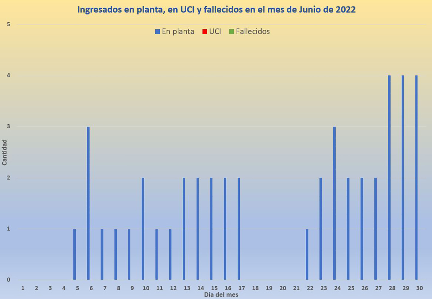 Un incremento que no solo se mantenía al empezar el mes de Julio, sino que llegaba a la media docena de hospitalizados el primer día del mes, si bien el sábado se comunicaba un alta que dejaba en 5 el número de pacientes ingresados, cifra que se mantenía sin variaciones en los datos de ayer domingo.