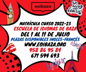 Novedades en la oferta educativa de la EOI de Baza para el próximo curso 2022-2023. La Escuela Oficial de Idiomas de Baza tiene abierto ya su plazo de matrícula, del 1 al 11 de julio, para todas aquellas personas que deseen aprender inglés o francés, desde el Nivel Básico hasta el Nivel Avanzado, en la modalidad presencial o bien los niveles básico e intermedio de inglés en la modalidad semipresencial.