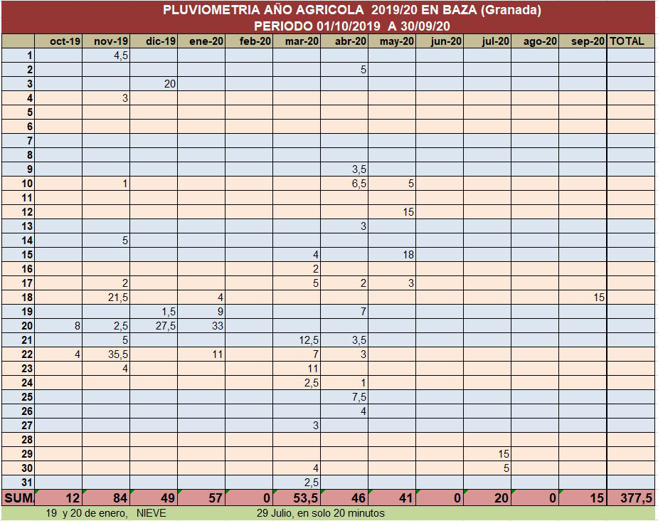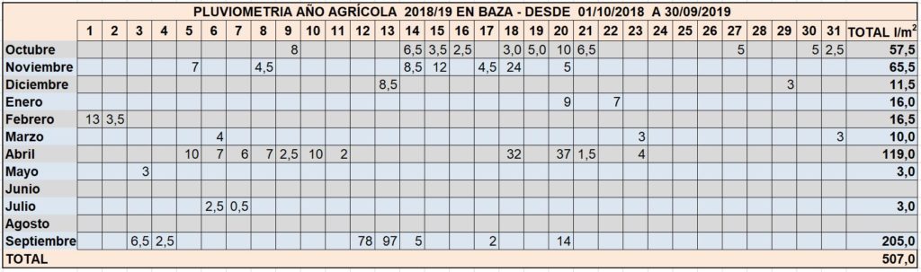 No obstante, si seguimos mirando hacia atrás, nos vamos al dato de que en el año hidrológico 2018-19 fueron 507 litros los que se recogieron en Baza y que en el año hidrológico 2017-18 fueron 481,5 litros por metro cuadrado los que nos obsequió la lluvia en Baza. Datos todos ellos que provienen de la estación meteorológica que uno de nuestros lectores, y colaborador en estos menesteres, Manuel Contreras, tiene instalada en su domicilio de la Plaza de Santiago, a cual hacen referencia los datos que ofrecemos en a este respecto.