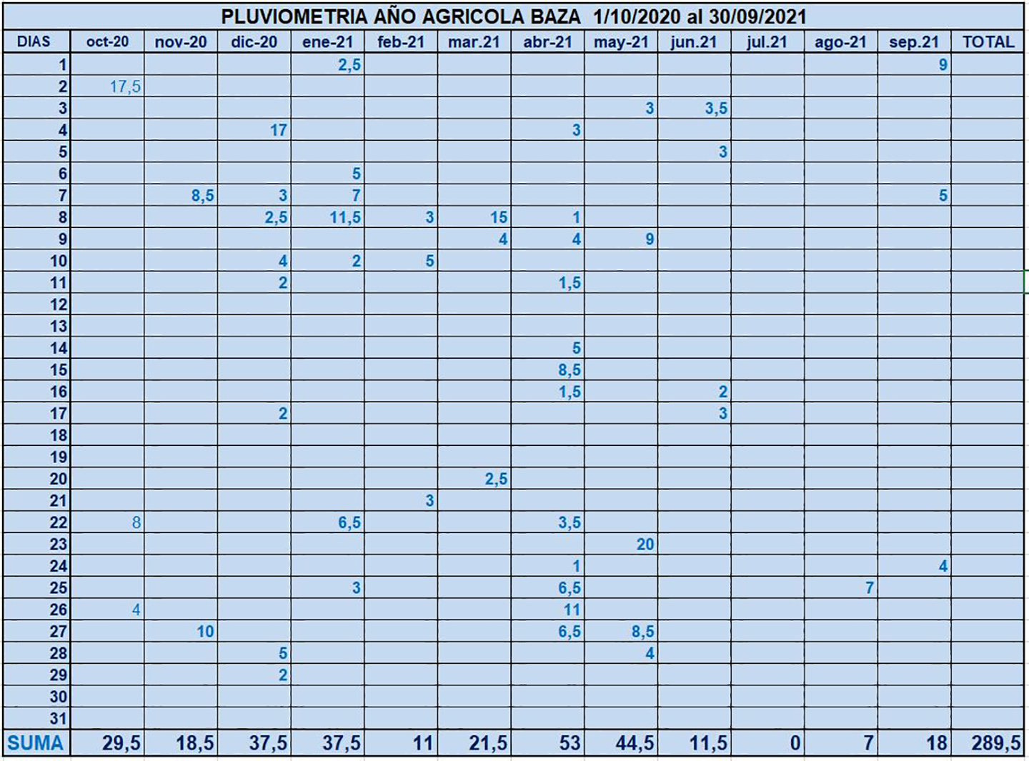 Del año 2020-21 hay que destacar que en el mes de julio no cayó en nuestra ciudad ni una gota, como suele decir el dicho popular, y que no llovió hasta el 25 de agosto cuando cayeron los únicos 7 litros registrados este mes. Dos meses estos de las seis mensualidades en las que el agua caída no llegó a los 20 litros, que es una cantidad bastante “apañada” para un buen día de lluvia, algo que por estos lares ya suena a desconocido, pues el día que más llovió en esta anualidad fue el 2 de octubre, hace más de un año pues, y cayeron 17,5 litros. Poco más hay que añadir. Pero es más, si nos vamos a la mitad, miren nuestros lectores el cuadro, a ver cuántos días cayeron diez litros. ¿Sorprendente, verdad?