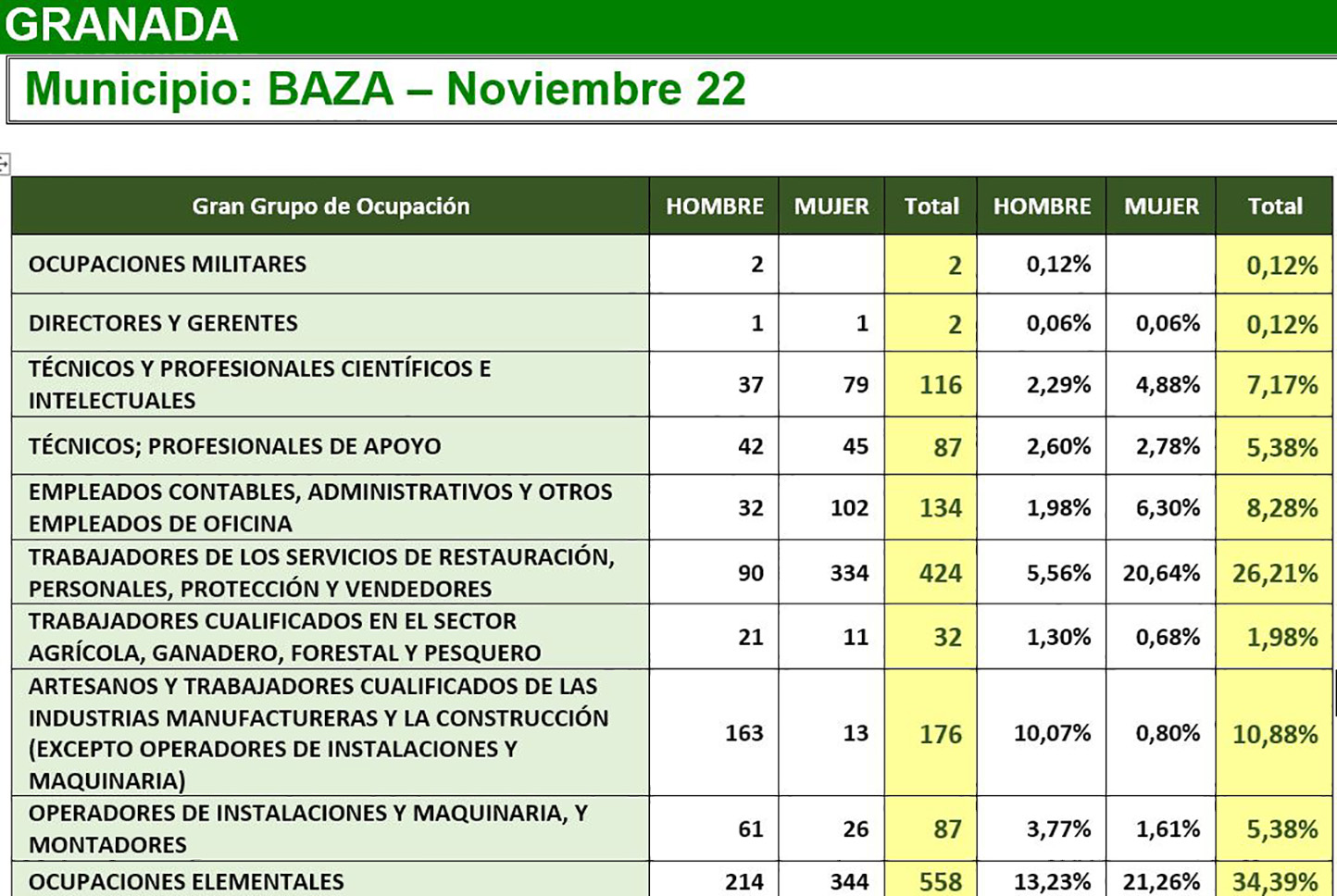 Mínimo descenso de la cifra de desempleados en Baza, al terminar el mes de noviembre. Finalizado el mes de noviembre, las estadísticas sobre personas desempleadas en nuestra ciudad han tenido una escasa variación de seis parados menos que hace un mes, concretamente 1.618 personas son las inscritas como demandantes de empleo sin ocupación actual, de los que 663 son hombres y 955 son mujeres.