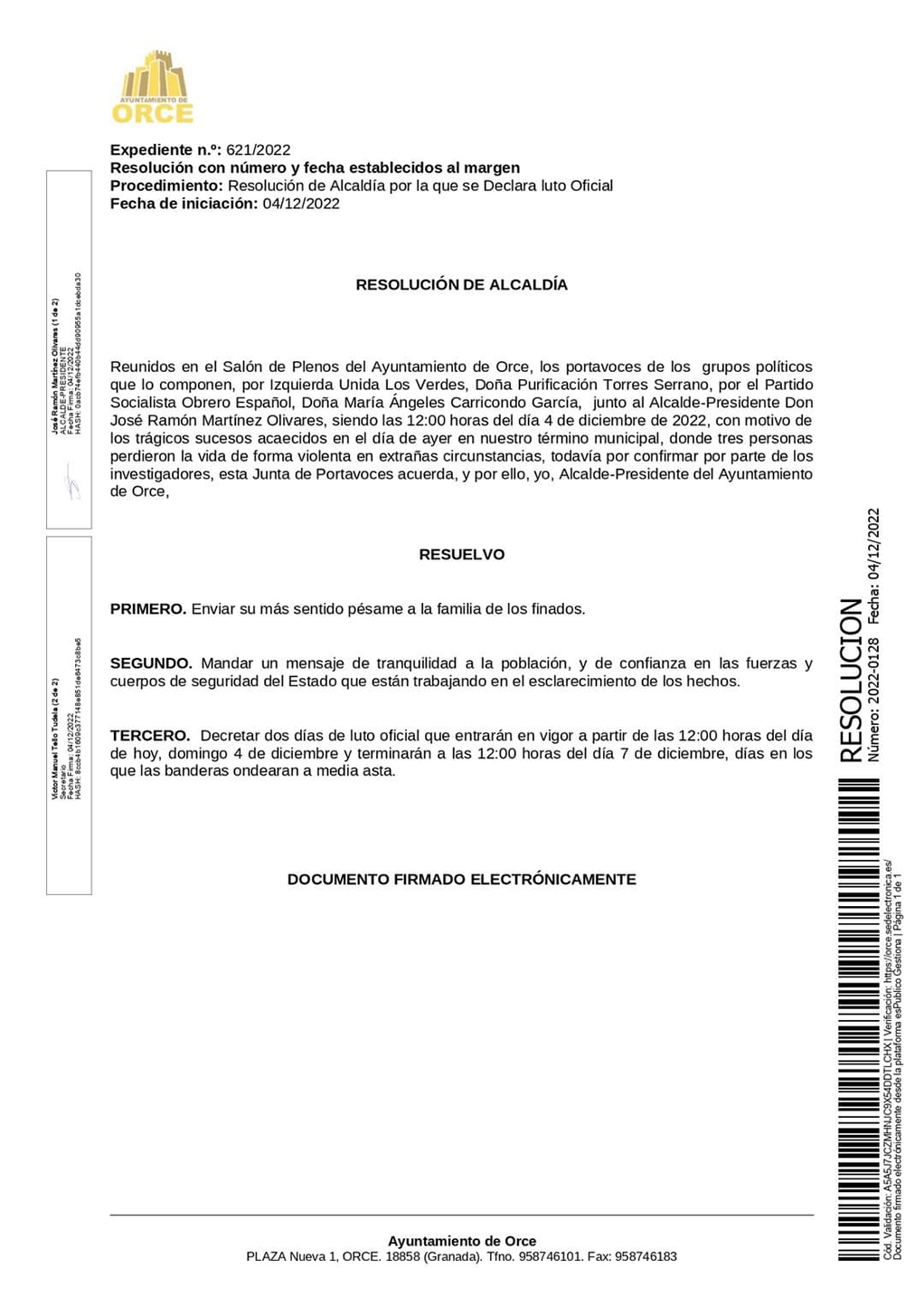 Mientras tanto, la localidad de Orce, un pueblo de poco más de 1.200 habitantes situado en la comarca de Huéscar, vive con gran consternación los hechos ocurridos, tras lo que ayer mismo el Ayuntamiento de la localidad, a través de una resolución de su alcalde, José Ramón Martínez Olivares, enviando el pésame a los familiares de los finados, enviar un mensaje tranquilizador a los orcerinos y de confianza a las fuerzas y cuerpos de seguridad del Estado, a la vez que decretaba dos días de luto que se iniciaban a las 12,00 horas de ayer domingo, momento desde el que las banderas ondean a media asta en el balcón del Ayuntamiento orcerino.