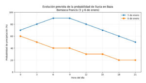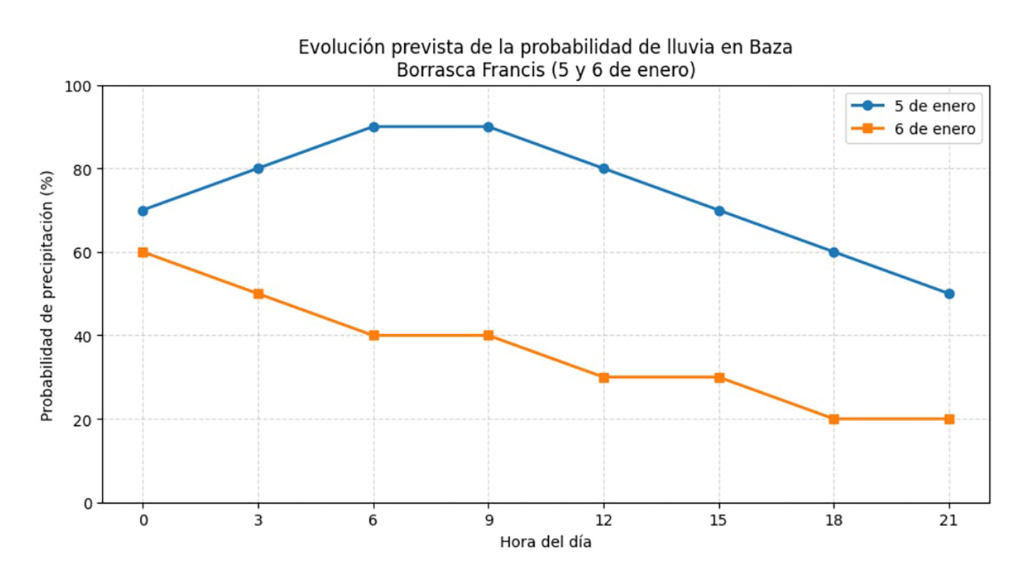 La borrasca Francis mantiene inestabilidad en la comarca de Baza para el 5 y 6 de enero. La borrasca Francis, un sistema de bajas presiones de origen atlántico que se ha desplazado sobre la Península Ibérica, dejará un periodo de tiempo inestable en la comarca de Baza durante los días 5 y 6 de enero, con probabilidades significativas de lluvia y temperaturas frías, según los últimos pronósticos meteorológicos.