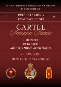 La Federación de Hermandades y Cofradías de Baza presentará el cartel de la Semana Santa 2025 el próximo 11 de enero. La ciudad de Baza comenzará a mirar de forma decidida hacia su Semana Santa antes de que concluyan las fiestas navideñas, con el anuncio de la presentación y exaltación oficial del cartel anunciador de la Semana Santa 2025. El acto, organizado por la Federación de Hermandades y Cofradías de Baza, se celebrará el próximo sábado 11 de enero, a las 12:45 horas, en el Auditorio del Museo Arqueológico Municipal.