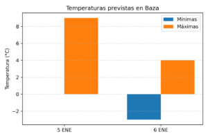 Baza adelantaba la Cabalgata de Reyes Magos a la mañana del 4 de enero ante la previsión de frío, lluvias y hasta posibles nevadas. La Cabalgata de los Reyes Magos de Baza se celebró finalmente en la mañana del domingo 4 de enero, tras la decisión municipal de adelantar un día su desarrollo habitual ante las previsiones meteorológicas adversas anunciadas para los días 5 y 6 de enero. Los pronósticos apuntaban a un descenso acusado de las temperaturas, lluvias persistentes y la posibilidad de nevadas en la comarca, circunstancias que llevaron a modificar el calendario tradicional del desfile.