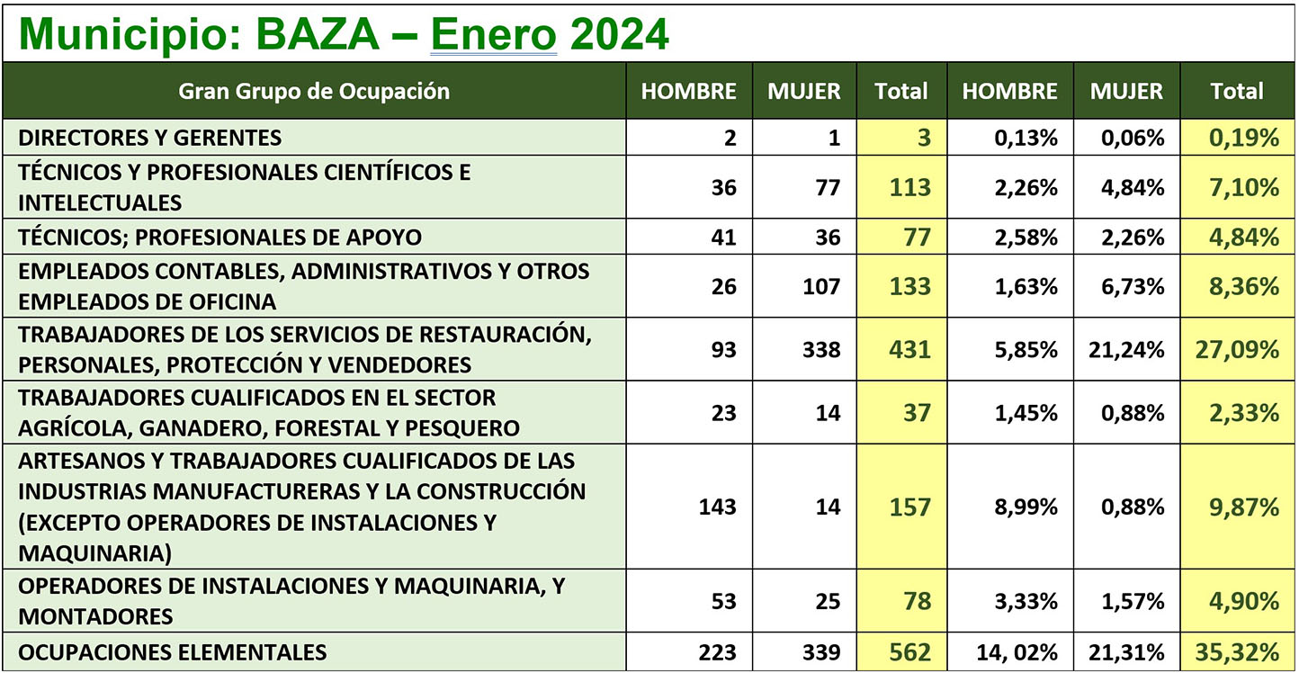 Cifras del paro, en Baza, que al finalizar el mes de enero incluyen cinco parados menos que un año antes, además de una bajada en la contratación. Llegados al final del mes de enero, la Oficina de Empleo registraba en Baza un total de 1,591 parados, de los que 640 son hombres y 951 mujeres, frente a los 1.596 (644 y 952) que había un año antes, habiendo logrado empleo cuatro hombres y una mujer, respecto a las cifras estadísticas de las que partimos y que un año antes mejoraron en 49 personas.