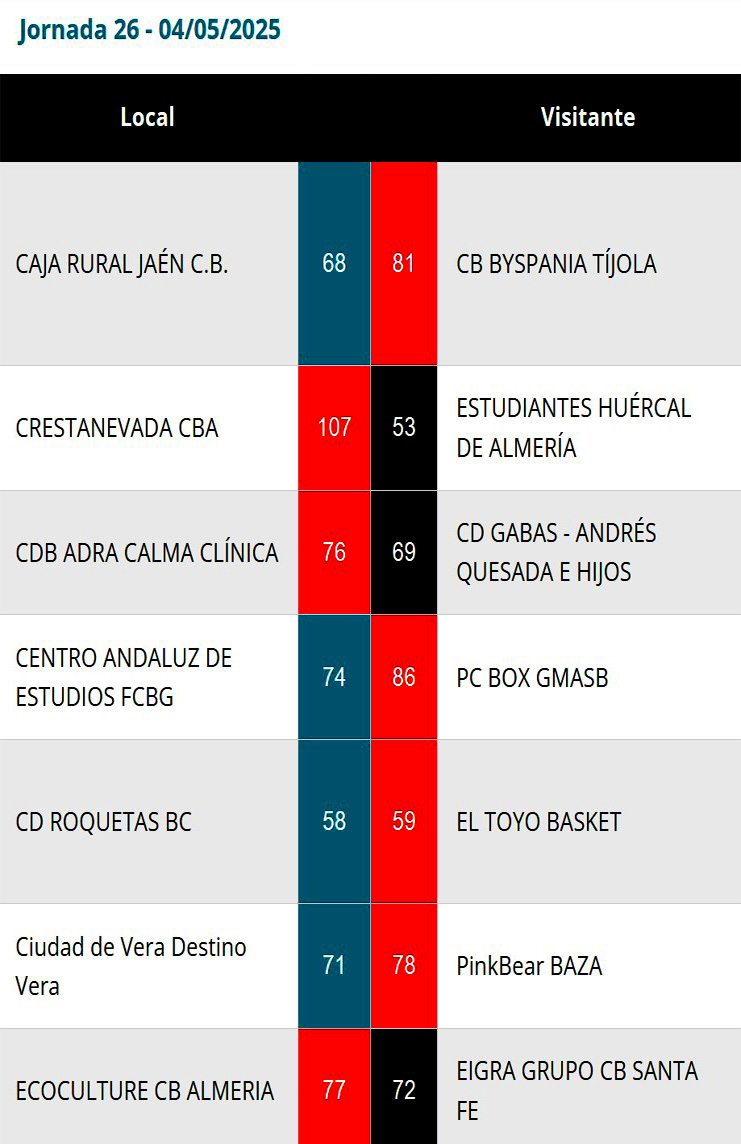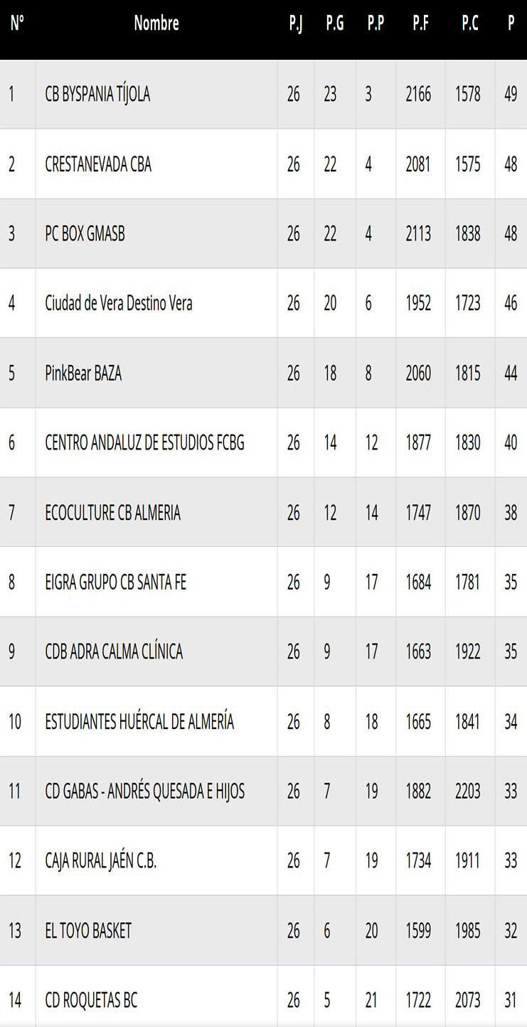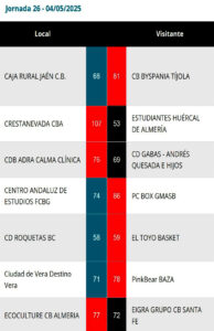 Resultados y clasificación en la Primera Nacional Andaluza de Baloncesto, tras la última jornada de la fase regular de la liga 2024-25. (Clicar en las imágenes para ampliarlas):