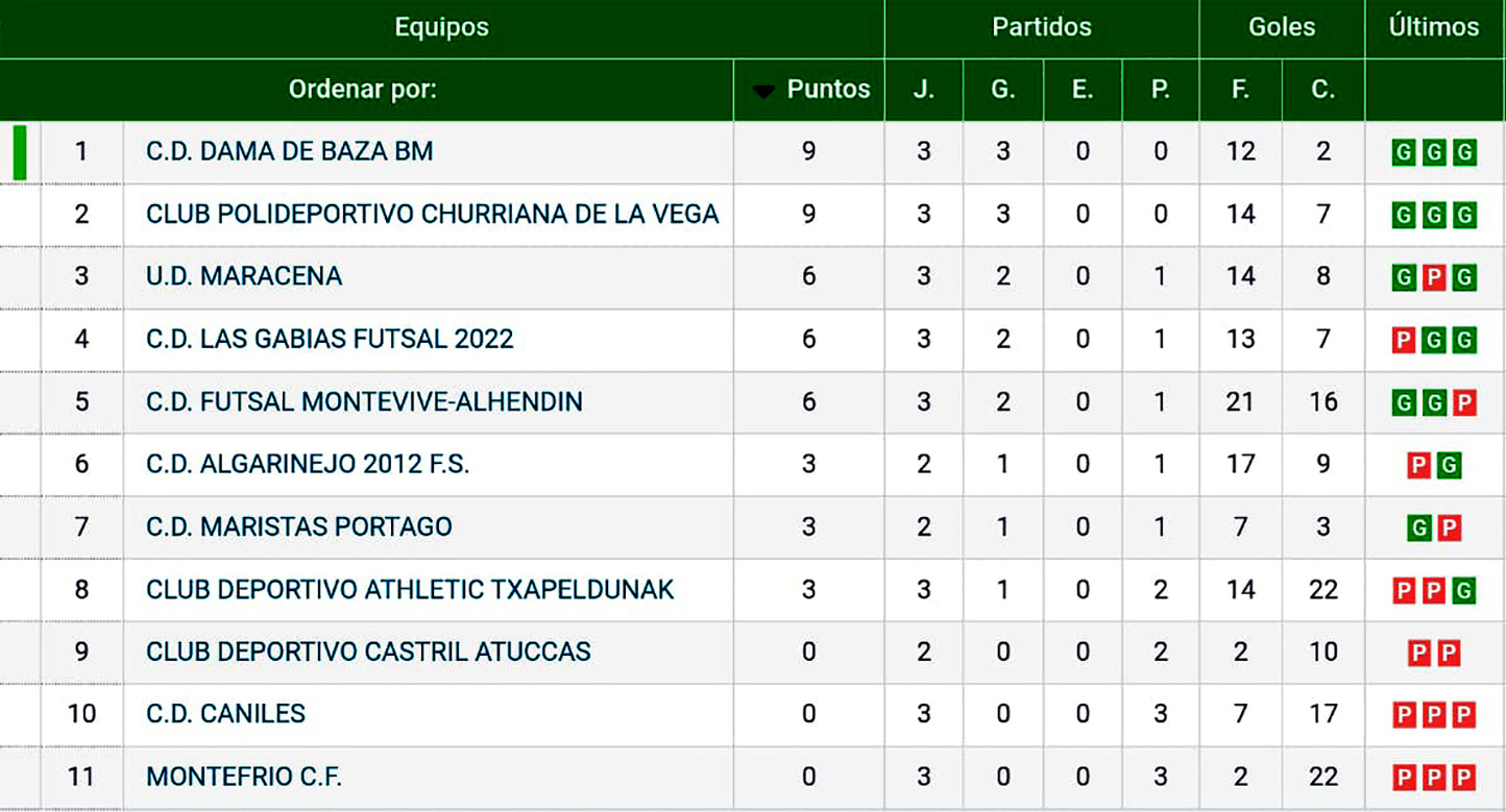 Así, tras la tercera jornada, el equipo bastetano se encuentra líder de la categoría de la Segunda Andaluza de fútbol sala senior de la provincia de Granada, contando sus partidos por victorias y empatado a puntos con el Churriana que ha seguido una similar trayectoria.