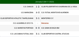 Resultados y clasificación, tras la jornada 3, en grupo granadino de la Segunda Andaluza Senior de fútbol sala. (Clicar en las imágenes para ampliarlas)