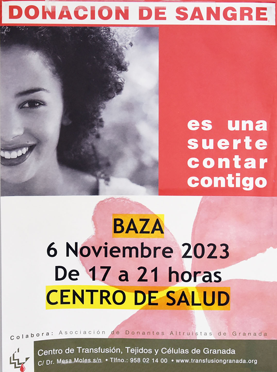 Hoy, lunes 6 de noviembre, tendrá lugar una colecta de donación de sangre, de 17 a 21 horas, en el Centro de Salud para tratar de conseguir que Baza sea autosuficiente. Este lunes, 6 de noviembre, se celebra en Baza la donación de sangre que periódicamente organiza en nuestra ciudad el Centro de Transfusión, Tejidos y Células de Granada, en estrecha colaboración con la Asociación de Donantes Altruistas de Granada.