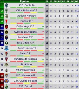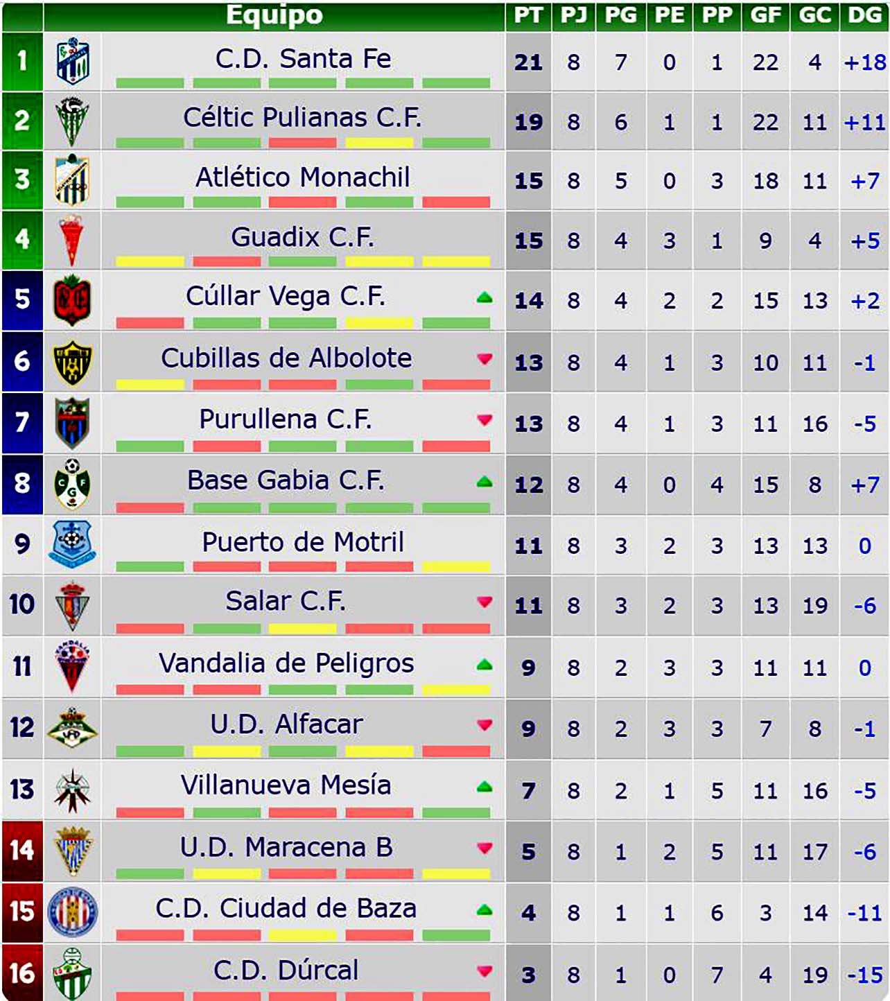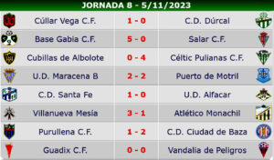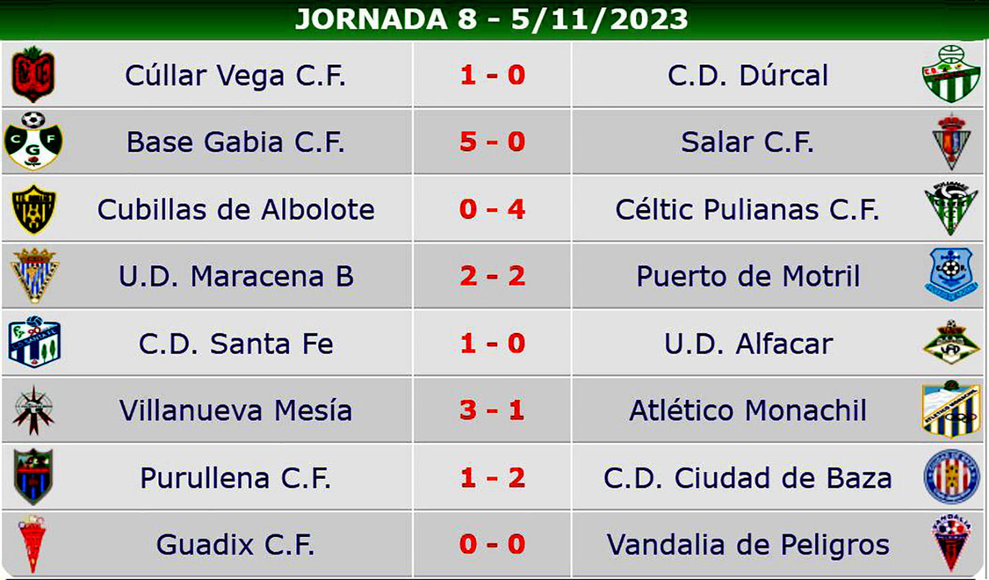 Resultados y clasificación, tras la jornada 8, en el grupo granadino de la Primera Andaluza Senior de fútbol. (Clicar en las imágenes para ampliarlas)