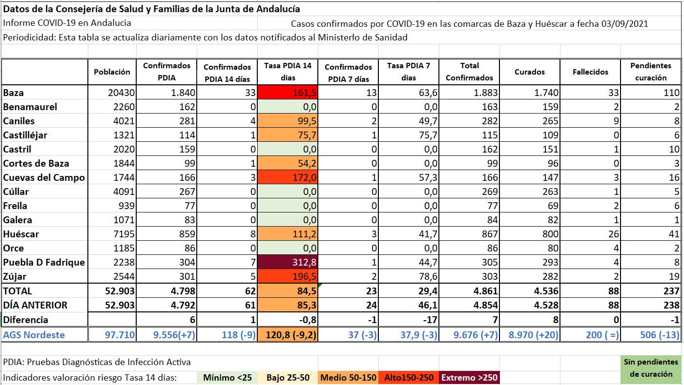 Dos municipios que se “desmarcan” de la tendencia seguida por el resto de localidades, pues Caniles mejoraba su tasa a 14 días y Baza, Cuevas del Campo y Puebla de don Fadrique la tasa a 7 días, con cifras que permiten aventurar una mejora venidera en el resto de parámetros, como en el caso de Huéscar que mejoraba ambas, mientras que Zújar empeoraba de nuevo.