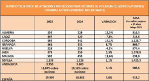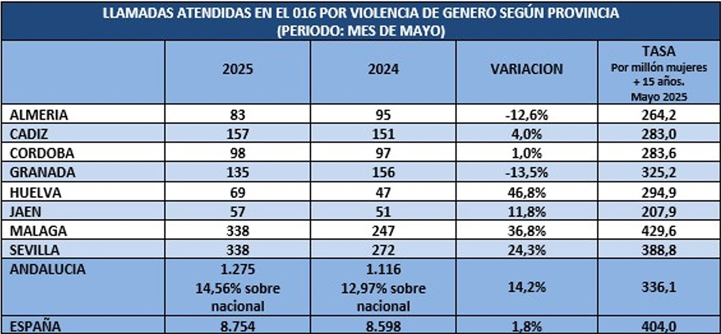 Aumentan los casos de violencia de género en Andalucía: más llamadas al 016, seis asesinatos en Andalucía y 22 en España y más de 26.500 casos activos en mayo. La violencia de género ha registrado un repunte significativo en Andalucía durante el mes de mayo de 2025. Según el informe de la Unidad de Coordinación contra la Violencia de Género de la Delegación del Gobierno en la comunidad, las llamadas al teléfono 016 aumentaron un 14,2% respecto al mes anterior, alcanzando las 1.275 consultas, lo que representa el 14,56% del total nacional. A nivel estatal, se contabilizaron 8.754 llamadas a este servicio, que ofrece atención psicológica, jurídica y asesoramiento general las 24 horas, todos los días de la semana.