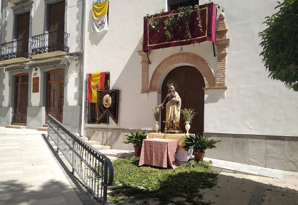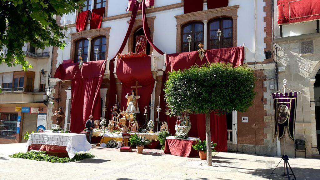 Lucía con esplendor el altar instalado ante el Casino, el cual se había confeccionado con la colaboración de los diferentes estamentos del mundo cofrade de la ciudad, con el fin de acoger esta primera salida en tan destacada festividad, después de que hubiese estado suspendida a consecuencia de la pandemia. Añadir que el altar tuvo como motivo religioso la representación de las tres virtudes teologales, Fe, Esperanza y Caridad, que se hicieron presentes mediante figuras alegóricas, acompañadas a los lados de la Santísima Trinidad y San José