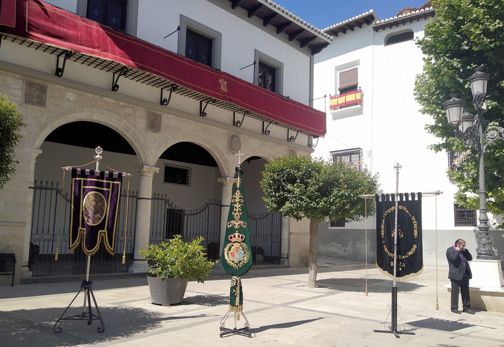 Brillante celebración de la festividad del Corpus Christi con un Acto Sacramental en la Plaza Mayor. Domingo soleado y de buena climatología en Baza, donde desde temprana hora la emblemática Plaza Mayor registraba una intensa actividad. Allí estaban las cofradías y hermandades dela ciudad, preparando una serie de instalaciones en las que destacaba el altar montado ante la fachada del Casino.