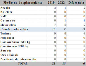 Si se tiene en cuenta la franja de edad, destaca el descenso en los diferentes grupos de edad mayores de 35 años, frente al incremento de los grupos de edad menores de 35 (con 0 fallecidos menores de 14 años en 2019 y 2022).