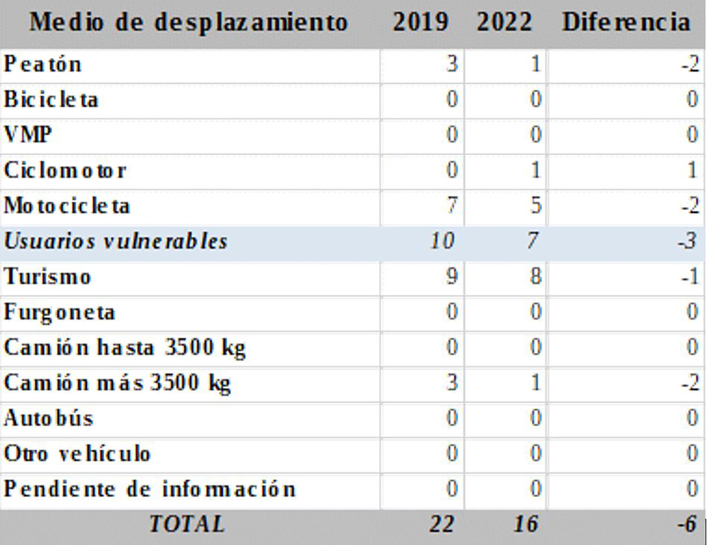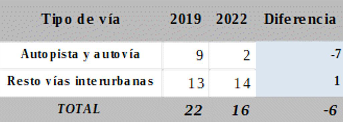 En función del tipo de siniestro, aumentan las salidas de vía, pasando de los 6 fallecidos en octubre de 2019 a los 9 en octubre de este año, aunque disminuyen en el resto de las tipologías de accidentes.