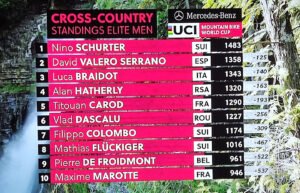 Precisamente fua al inicio de esa última vuelta cuando David Valero dejó la cola de su grupo y se fue decidido a colocarse en la segunda posición de la carrera, en la que se iba intercambiando con Colombo, con momentos como en una de las últimas subidas Valero vio que su bicicleta patinaba y echó pie a tierra o cuando Schurter sufrió una caída y se quedó algo más rezagado, junto a Pierre de Froidmont, lo que sirvió para pensar que las dos medallas restantes se las disputarían Colombo y Valero, como así fue y por este orden, mientras que Luca Braidot recibió premio a su esfuerzo, siendo el cuarto en la meta y, tras él, Pierre de Froidmont que completaba el podio en la quinta posición. El líder de la Copa del Mundo, el suizo Nino Schurter, tuvo que conformarse con el sexto puesto, a1’ y 50” del vencedor y arañando 130 puntos, dejando en 30 puntos menos la diferencia que ahora tiene sobre el ciclista bastetano.