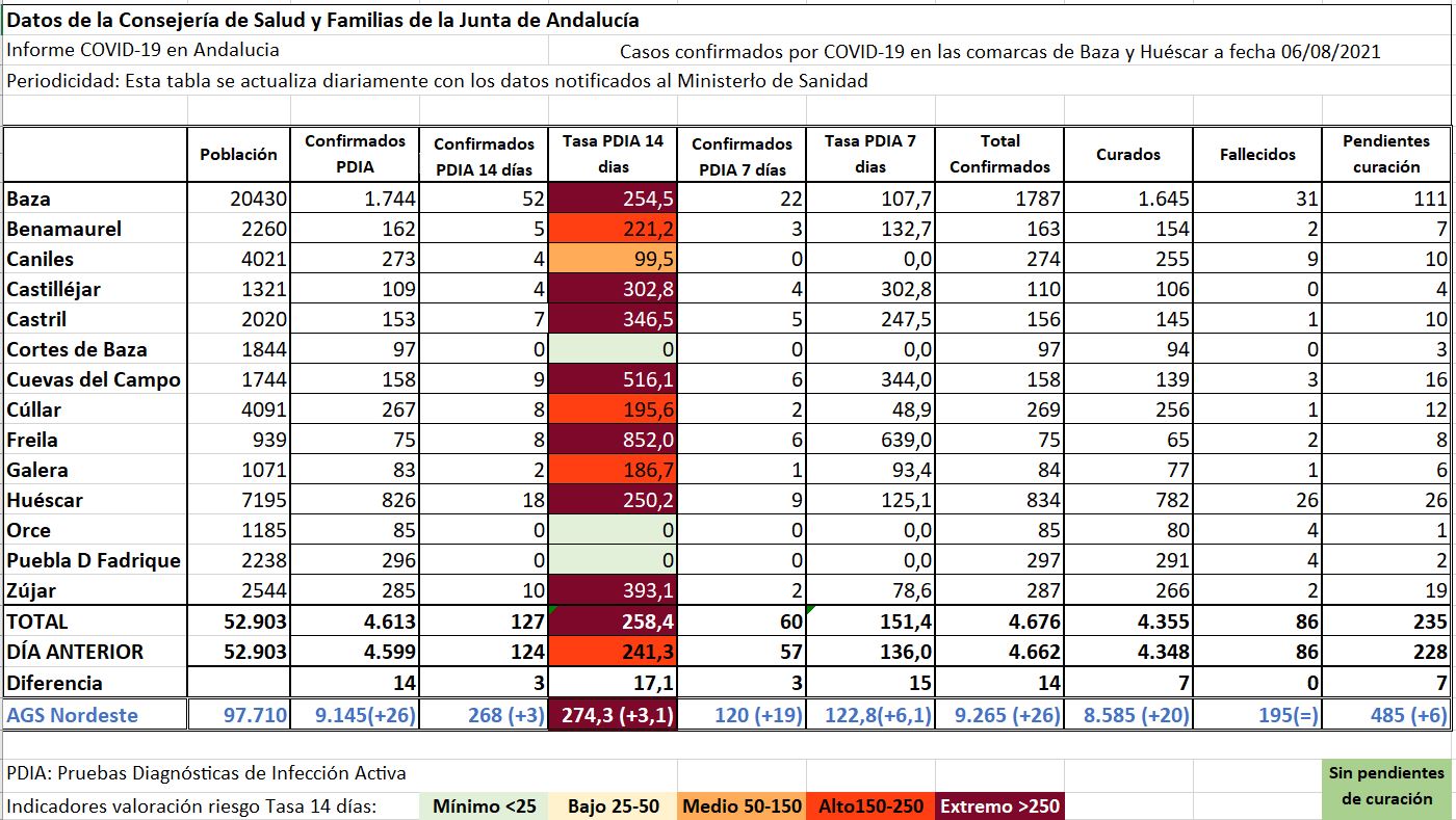 En cuanto a la última jornada, los datos de la misma fuente hablan de 14 nuevos positivos, con fecha del viernes 6, de los que se validaron 6 en Baza, 2 en Cúllar 2 en Huéscar y uno en cada municipio de Castilléjar, Cuevas del Campo, Freila y Zújar, con diferentes resultados en los incrementos de las tasas de incidencia, algo que siempre perjudica más a las localidades de menor población, como ocurre con Freila en donde crece más de 100 puntos o Castilléjar, donde supera los 75.