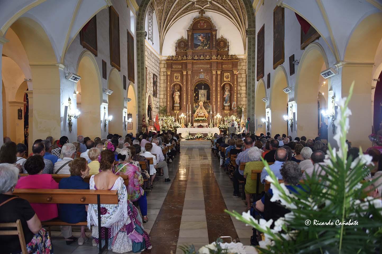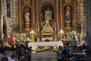 Pero siguiendo la cronología, la lluvia parecía alejarse y se llegaba sin amenazas a la hora de celebración de la Solemne Eucaristía en honor a La Santísima Virgen de la Piedad, con una notable afluencia de fieles que ocuparon todos los asientos de la iglesia y ocuparon de pie las diferentes capillas, hasta el punto de que las puertas del templo permanecieron abiertas durante la celebración que, algunas personas siguieron desde la misma plaza.