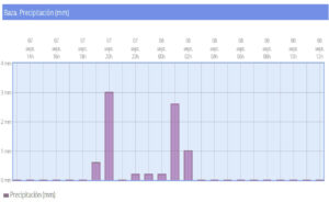 Por lo demás, hay que informar que la lluvia caída sobre nuestra ciudad empezó con 0,6 litros por metro cuadrado que se recogieron a las seis de la tarde, a los que se añadieron una hora después otros 3 litros por metro cuadrado. A partir de ahí se abrió el cielo y parecía que la lluvia se había terminado, algo que no fue así y que se transformó en un incómodo chispeo, con algunos instantes más denso, pero que supuso añadir otros 0,6 litros por metro cuadrado, entre las diez y las doce de la noche, tras lo que arreció un poco más, con 2,6 l/m2 recogidos a la una de la madrugada y, finalmente, 1 l/m2 más a las dos de esa misma madrugada. En total, 7,8 l/m2, una cantidad que supo bien, después de un prolongado tiempo de sequía, pero que también supo mal por lo que supuso de restar asistencia a una noche de feria en la que feriantes y hosteleros habían puesto muchas esperanzas en ella.