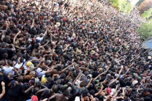 La multitud de una infinita marea negra corrió veloz por las serpenteantes Arrodeas donde, por cierto, han crecido los bancos-miradores por su recorrido, para terminar plantándose en el primer hito donde jurar bandera, en un abrir y cerrar de ojos. Por cierto, ojos que dejaban ver el disfrute de todos los implicados, saboreando desde el inicio una diversión que era total y para todos y dando paso a esa primera jura que este año no ha sido al comenzar el asfalto, porque este ha crecido en sentido ascendente, lo que no influyó en hacer la pausa en el lugar de costumbre.