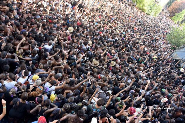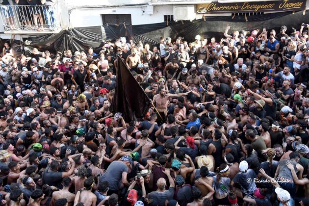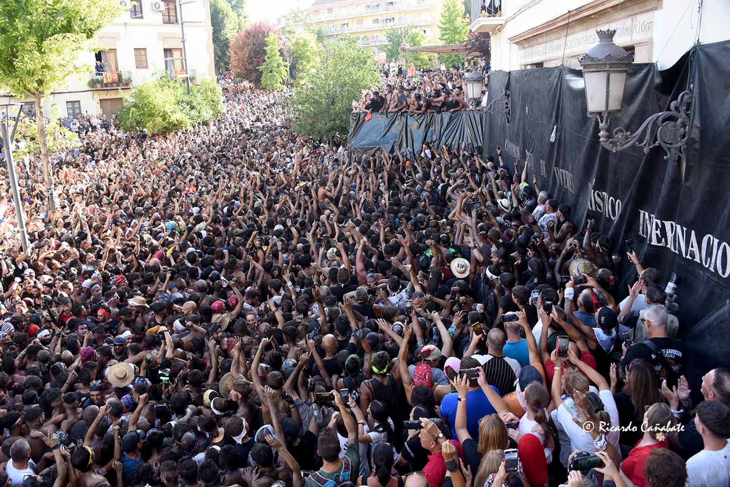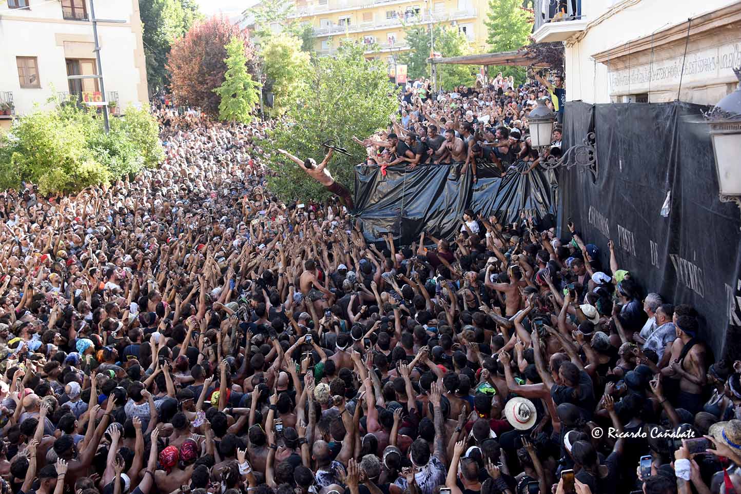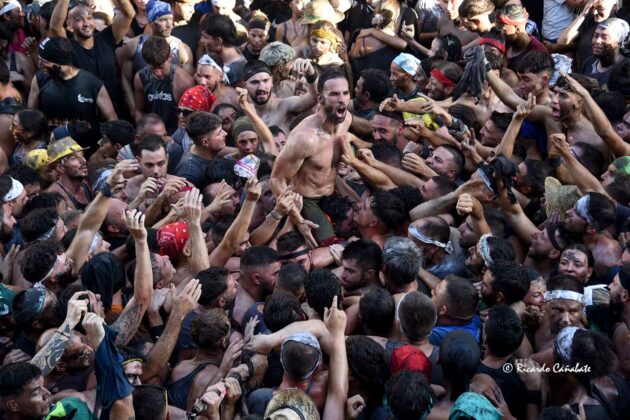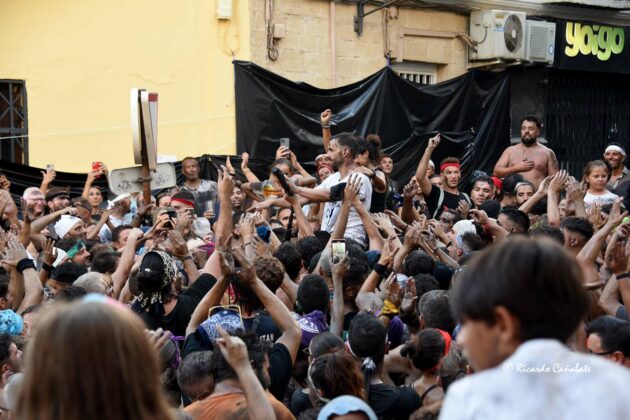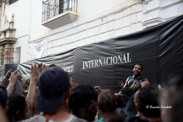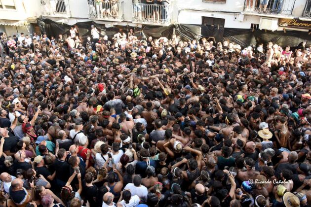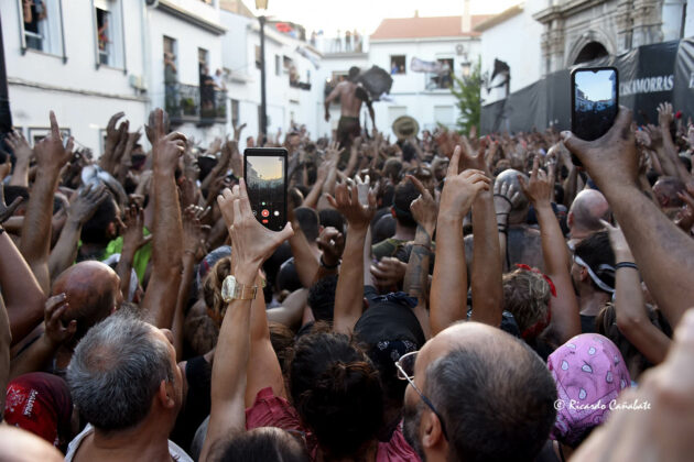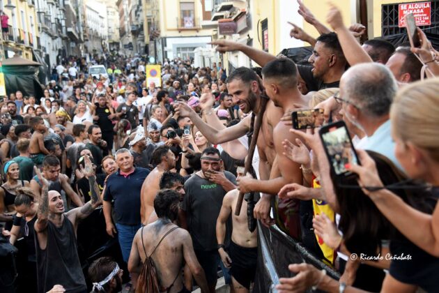 Desde allí, no tardó en divisarse la zona de los Caños Dorados, donde parecía ser necesario un milagro que hiciera el hueco por el que pasar. No sin esfuerzo, lo hicieron el tambor y la bandera para, unos minutos más tarde, ver al Cascamorras subido en la terraza del antiguo Hostal Mariquita, jaleando a la multitud y capitaneando todos los vítores habidos y por haber, hasta que empezó a escucharse el ¡¡¡Tírate, tírate…!!! que llevó a Jose Heras a saltar la baranda y dar la espalda a la multitud, colocándose la porra en torno al cuello y ejecutando un perfecto salto del “cristo”, que fue jaleado y vitoreado hasta la saciedad. Después, el paso por la fuente y una jura de bandera que redondeaba el éxtasis de unos momentos inolvidables, que dieron paso poco después con la repetición de la pirueta desde la terraza que hace esquina entre San Francisco y el inicio de la calle Agua.