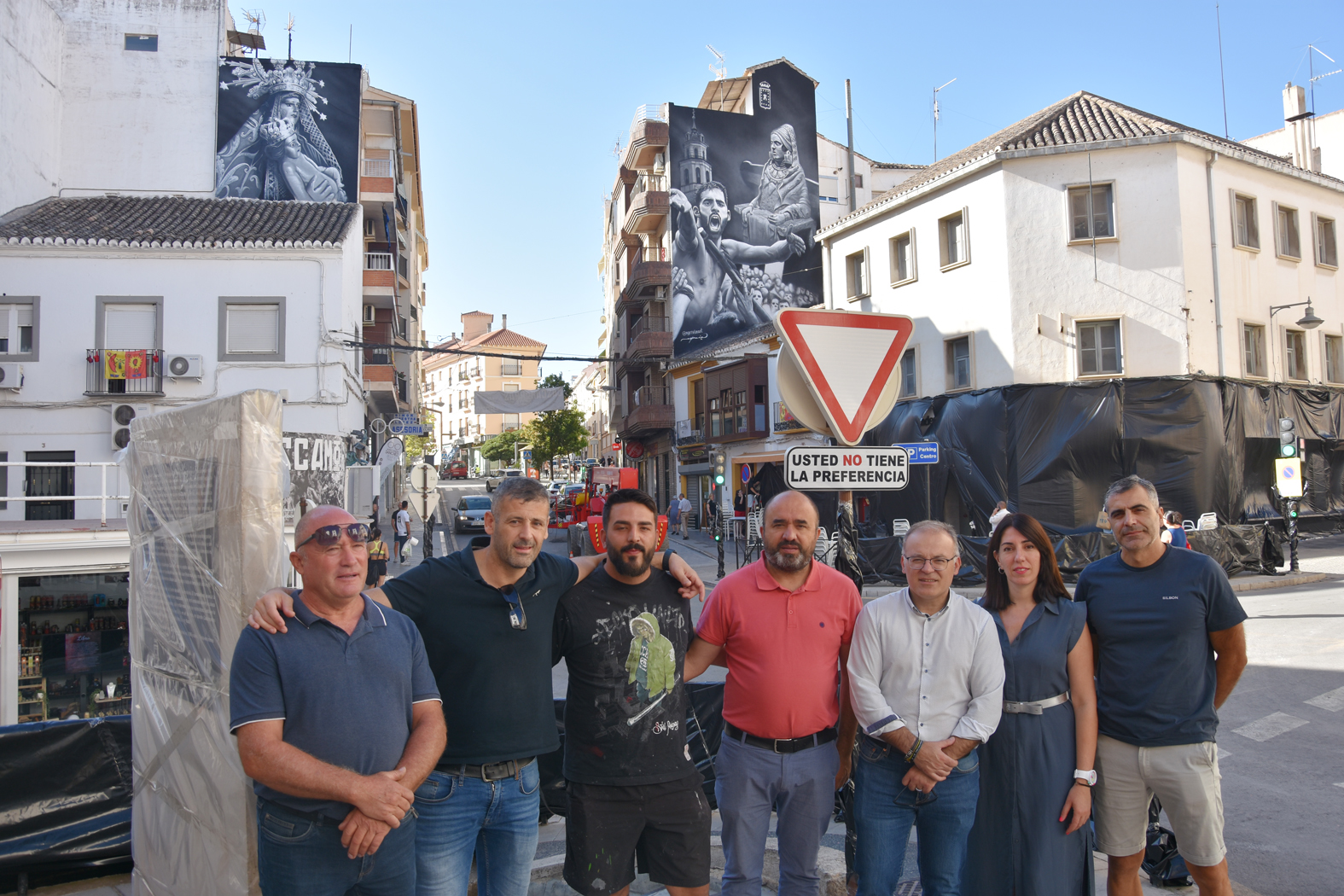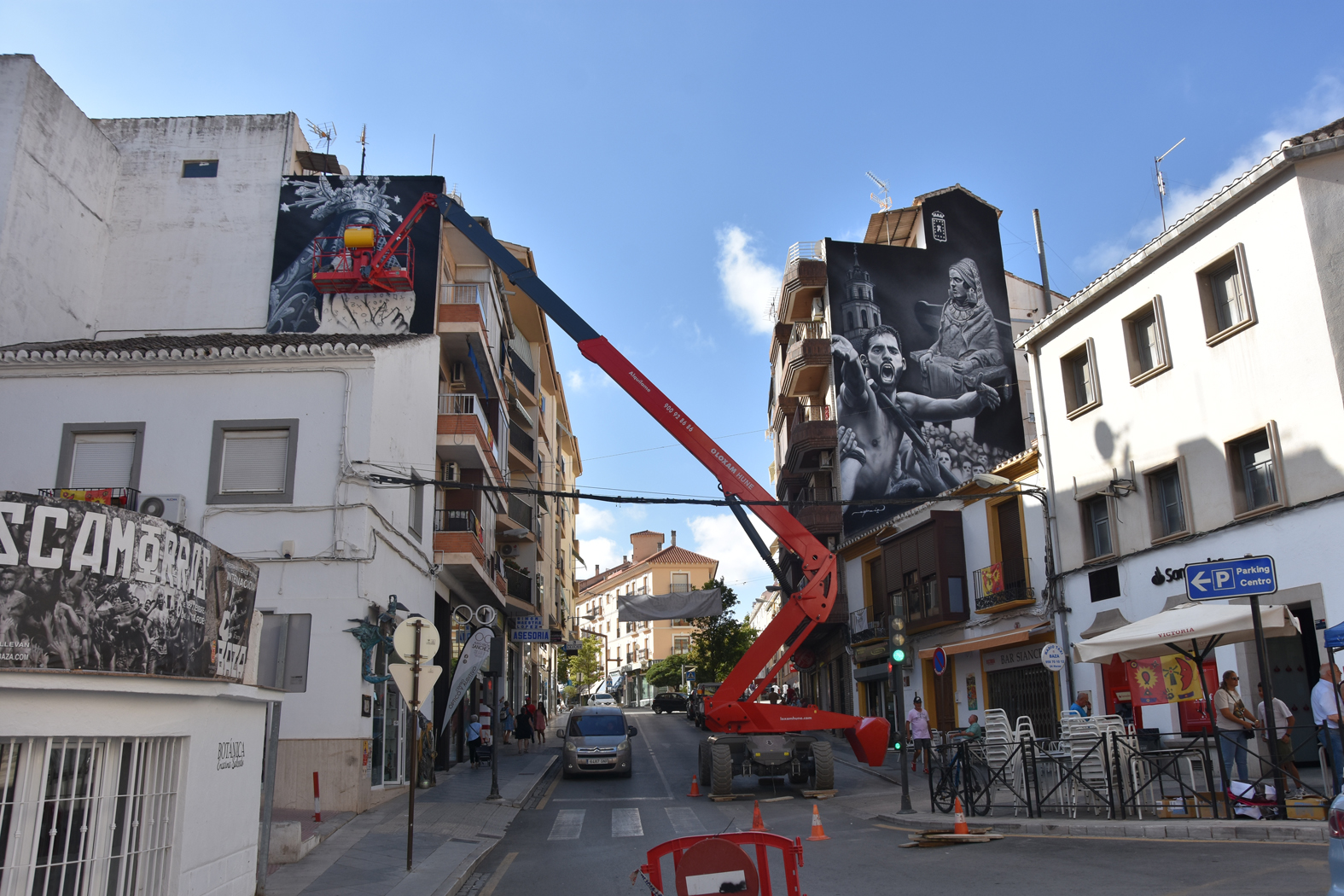 Para este trabajo se tuvo que contratar una máquina elevadora, algo que no pudo lograrse en nuestra ciudad y que obligó tener que desplazar la máquina adecuada desde Granada, en la que se incorporaba una cesta desde la que el artista realizaba su obra.