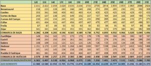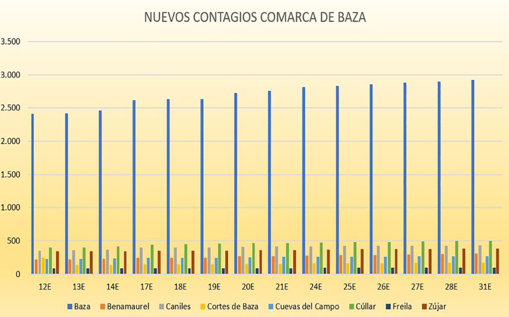 Y si nos referimos al ámbito local, los municipios que destacan en este lunes son los siguientes: Huéscar que ha sumado 36 nuevos contagios y sube su tasa a 14 días, mientras paradójicamente baja la de 7 días; Baza, que no se ha quedado corta con otros 32 contagios más; Galera con 7 contagios más y Zújar con otros 6 y suben su tasa a 14 días; Castril con 7 contagios más y La Puebla don Fadrique con otros 2, municipios que suben ambas tasas, mientras que en el resto de poblaciones, la bajada de tasas ha sido la línea común que se refleja en estos datos y los municipios con mejor comportamiento que han sido los de Castilléjar que no ha sumado ningún contagio, Cortes de Baza y Orce que han sumado uno y Caniles, Cuevas del Campo y Cúllar que han sumado dos contagios nuevos.
