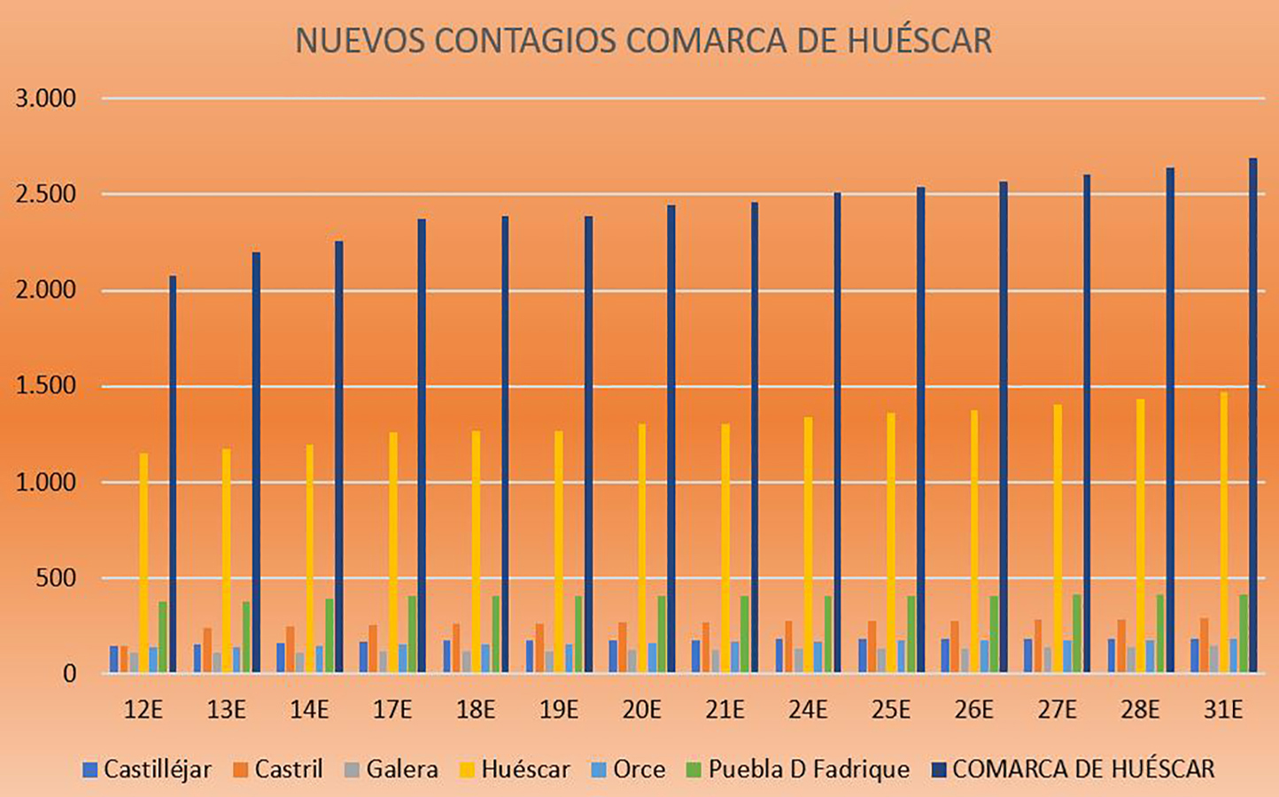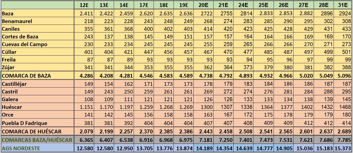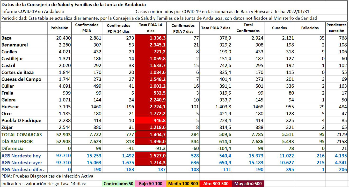 Y si nos referimos al ámbito local, los municipios que destacan en este lunes son los siguientes: Huéscar que ha sumado 36 nuevos contagios y sube su tasa a 14 días, mientras paradójicamente baja la de 7 días; Baza, que no se ha quedado corta con otros 32 contagios más; Galera con 7 contagios más y Zújar con otros 6 y suben su tasa a 14 días; Castril con 7 contagios más y La Puebla don Fadrique con otros 2, municipios que suben ambas tasas, mientras que en el resto de poblaciones, la bajada de tasas ha sido la línea común que se refleja en estos datos y los municipios con mejor comportamiento que han sido los de Castilléjar que no ha sumado ningún contagio, Cortes de Baza y Orce que han sumado uno y Caniles, Cuevas del Campo y Cúllar que han sumado dos contagios nuevos.