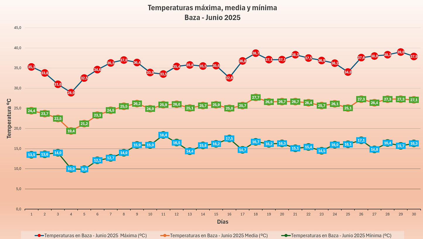Finaliza el mes de julio más caluroso, desde que hay registros en Baza, con temperaturas rozando 40ºC en varios días y nos metemos en un julio que no será más fresco. El mes de junio ha dejado temperaturas notablemente altas en la ciudad de Baza, con registros que, en varias ocasiones, se han acercado o incluso superado los 38ºC. Según los datos registrados durante los 30 días del mes, según datos de AEMET. La temperatura máxima más alta se produjo el día 29 de junio, cuando el termómetro alcanzó los 39,0ºC, seguido de cerca por los días 28 y 30, con 38,3ºC y 37,9ºC, respectivamente.