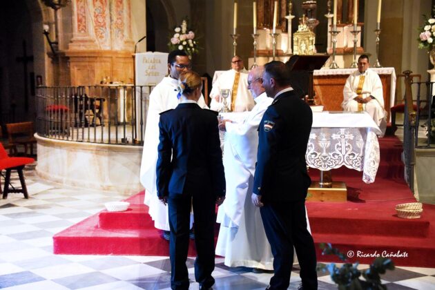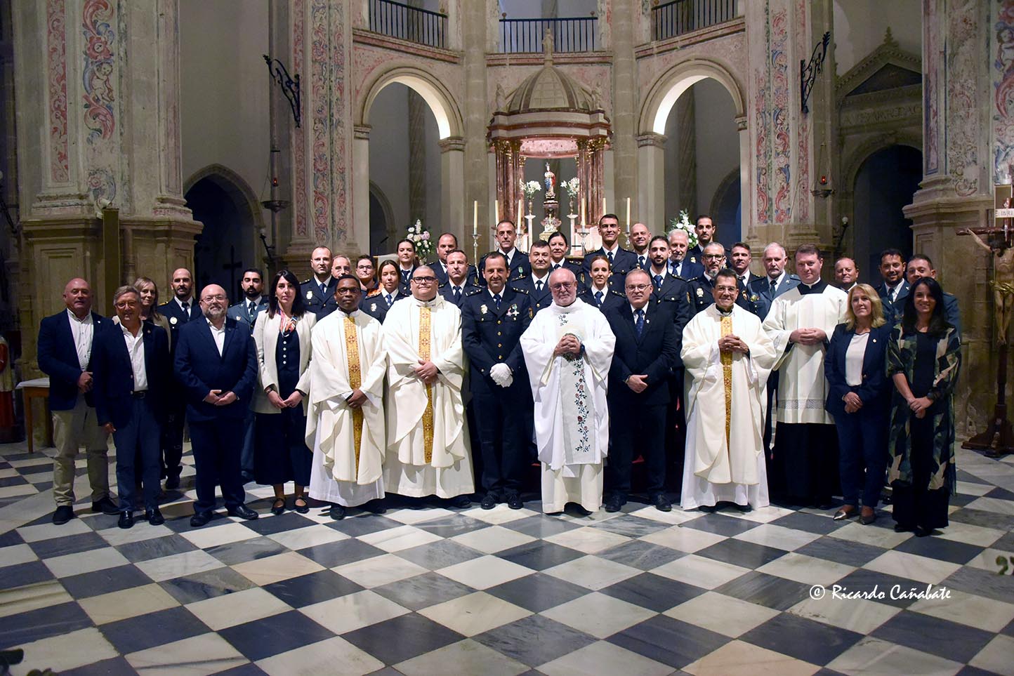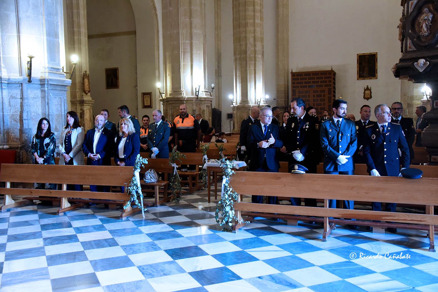 La Policía Nacional celebraba ayer el Día de los Santos Ángeles Custodios en Baza en una emotiva jornada y con el reconocimiento a la labor de todos sus agentes. Unos actos que estuvieron marcados por el reconocimiento a la dedicación y esfuerzo de los agentes, así como el homenaje a aquellos que han pasado a segunda actividad o han fallecido en acto de servicio y que se iniciaban en la Iglesia Mayor, con la celebración de una solemne y participativa Eucaristía, concelebrada por su párroco y la práctica totalidad del clero local, en la que se contó con la presencia del Comisario de Baza, Mario López García, y un numeroso grupo de efectivos policiales, representantes de la Guardia Civil, el alcalde bastetano y un grupo de corporativos del Equipo de Gobierno y del G.M. del PSOE; jefes de la Policía Local y Bomberos y miembros de Protección Civil, así como el anterior comisario, Antonio Mirallas.