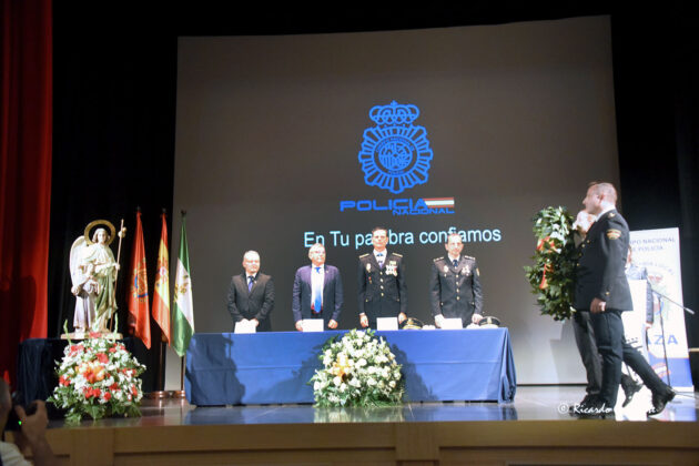 Finalizado el acto religioso, la cita seguía en el Teatro Dengra, donde se recibía al subdelegado del Gobierno en Granada, José Antonio Montilla Martos y al Comisario principal, jefe provincial de la Jefatura Superior de Andalucía Oriental, Juan de Dios Piedra Martínez. Un acto que se iniciaba con unas palabras del comisario Mario López, quien agradeció la colaboración de las instituciones y la entrega de todos los miembros de la Policía Nacional, destacando que las tasas de criminalidad en la ciudad se han mantenido estables, gracias al trabajo diario contra la delincuencia y los grupos organizados. Además, subrayó la importancia de los dispositivos de seguridad implementados en eventos locales como la Feria de Baza y el Cascamorras, que este año contó con una afluencia superior a la de años anteriores.
